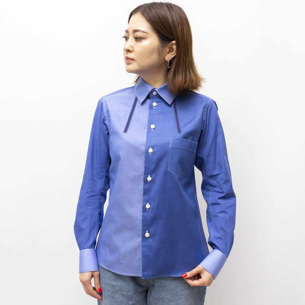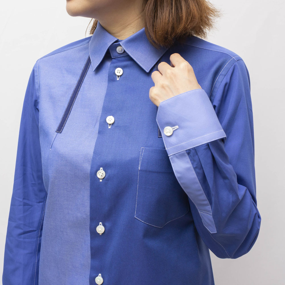 ブルーの同系色の生地を組み合わせ、コントラストをきかせた白のステッチがアクセントになったスタイリッシュな1着です。