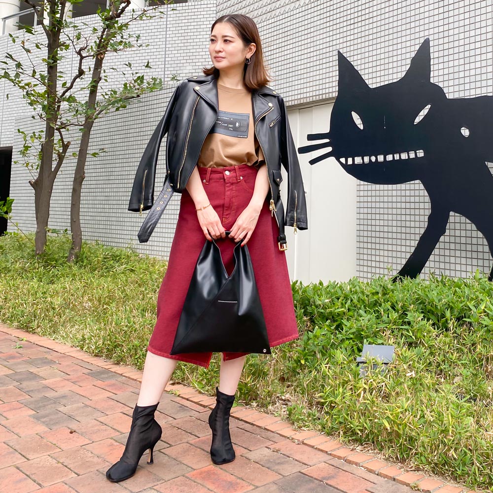 膝丈でトップスとのバランスが取りやすい着丈で、メリハリのある台形フォルムに仕上がりました。