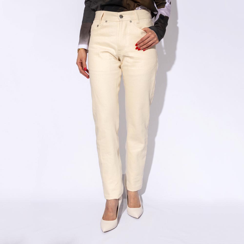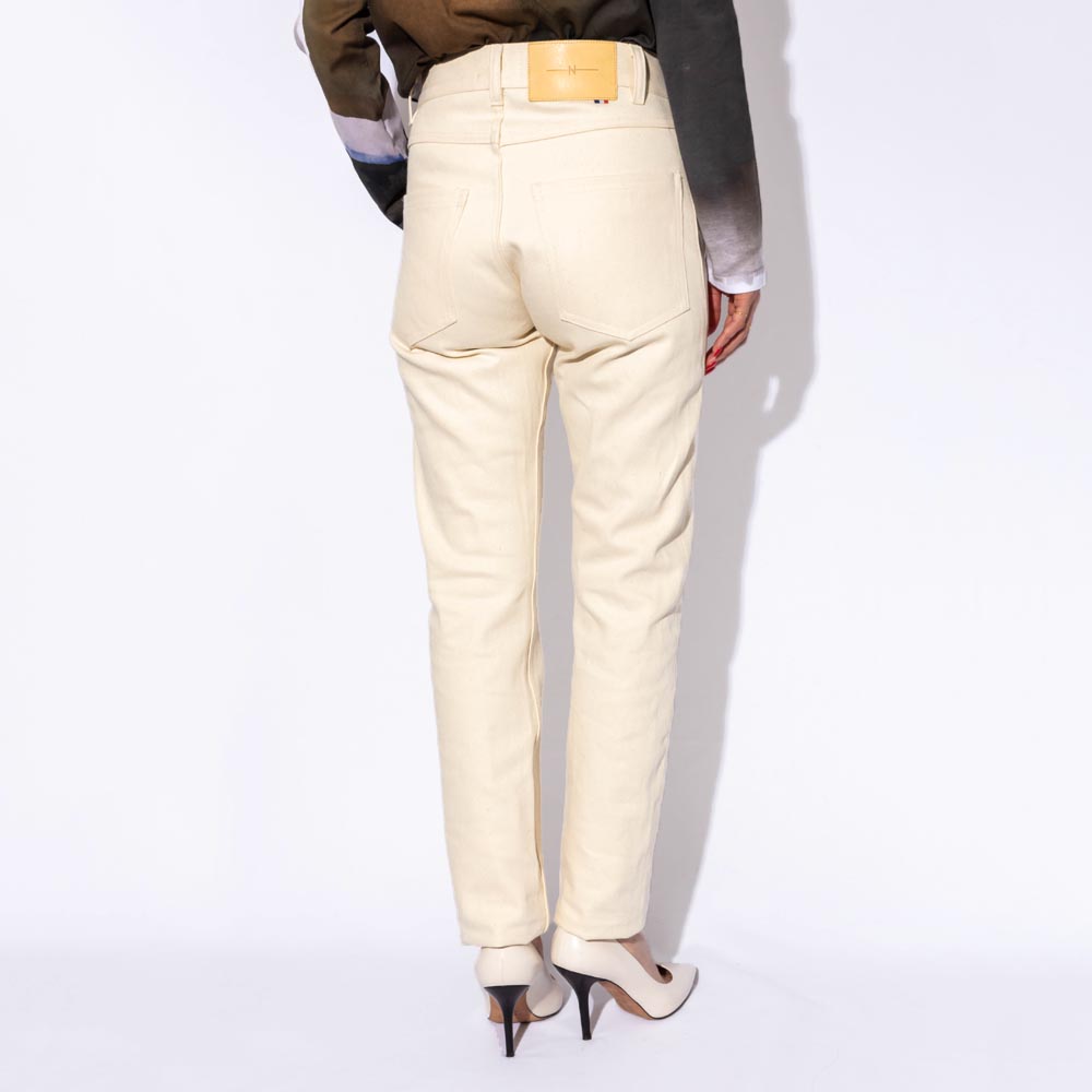 ヒップやウエストがフィットした細身のストレートラインのシルエットで、テーパードのラインが日本人の脚のラインにもマッチします。