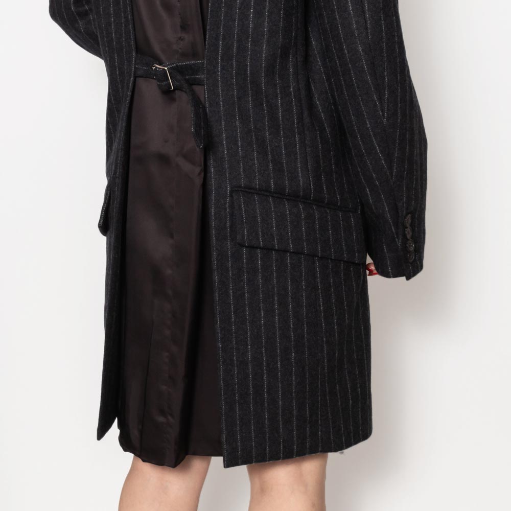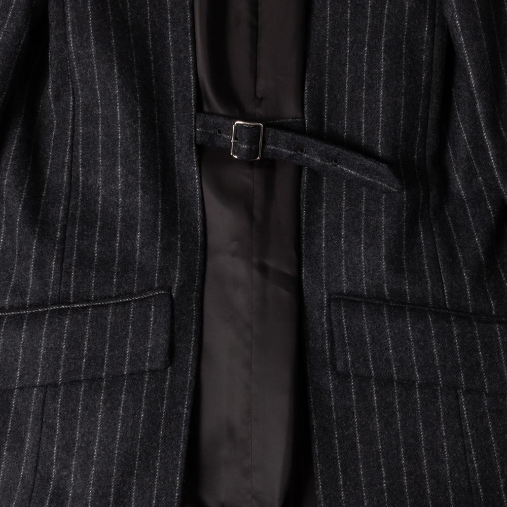 ウール100%のピンストライプのフランネル生地と、裏地と後身頃にキュプラを使用しています。