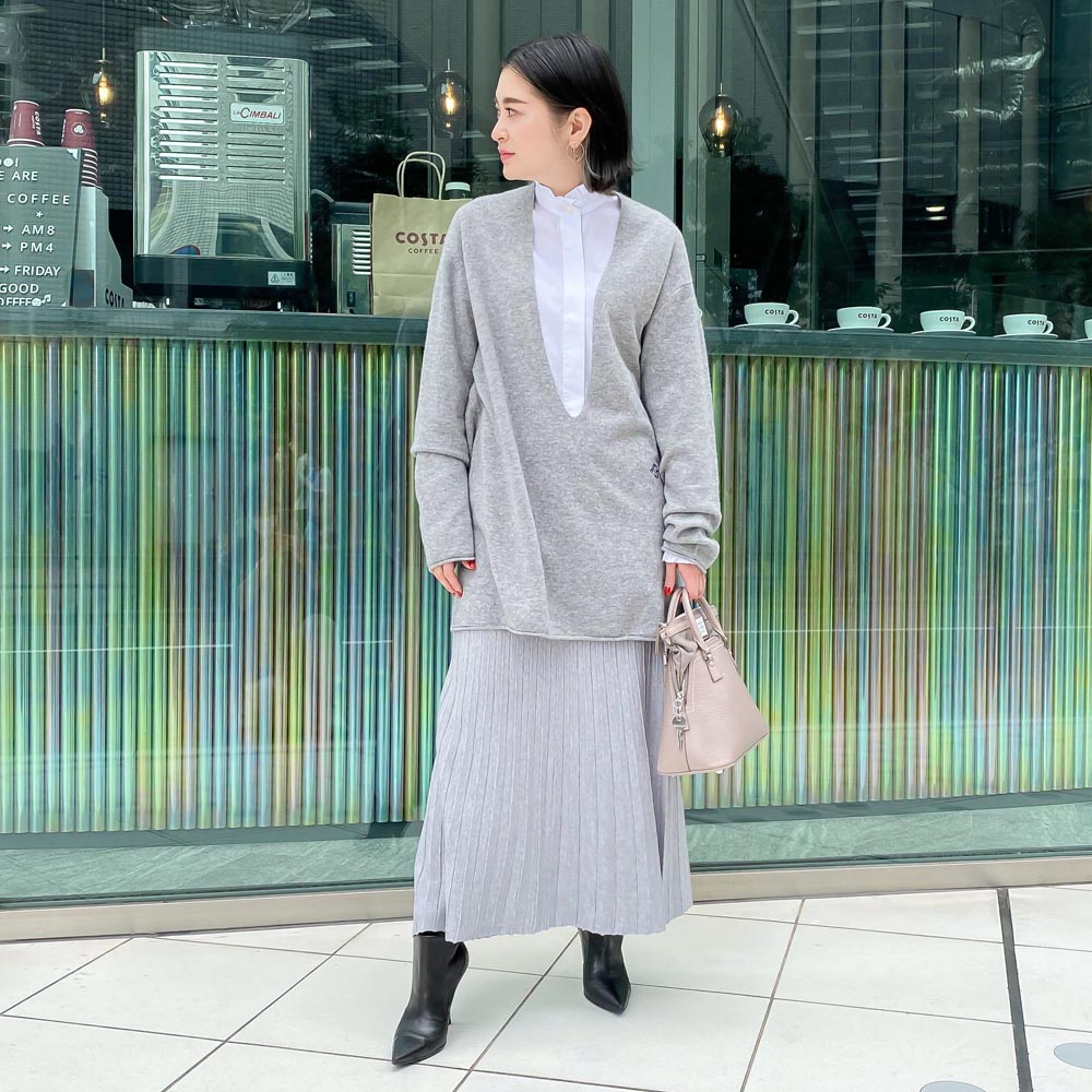 薄手のニットを使用し、プリーツのひだをほとんど作らずプリーツを作っているので、ニットのボリュームも多くならず軽やかな見た目に仕上がっています。
