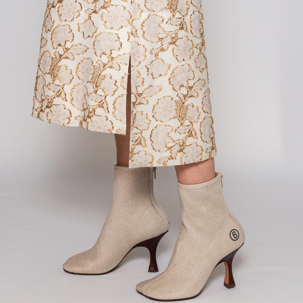 スリットが入っているので、裾部分の裏地にはとろみのあるアセテート生地を施し、足元を美しく見せています。