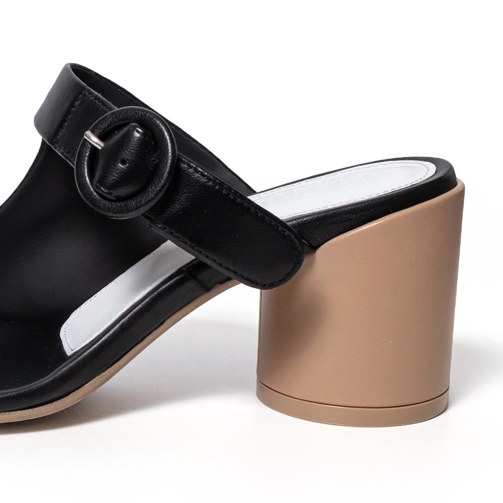 素肌の露出が多いデザインでモードと色気を絶妙にミックスしつつ、レザーで包んだ丸いストラップの留め具は愛らしい印象をプラス。