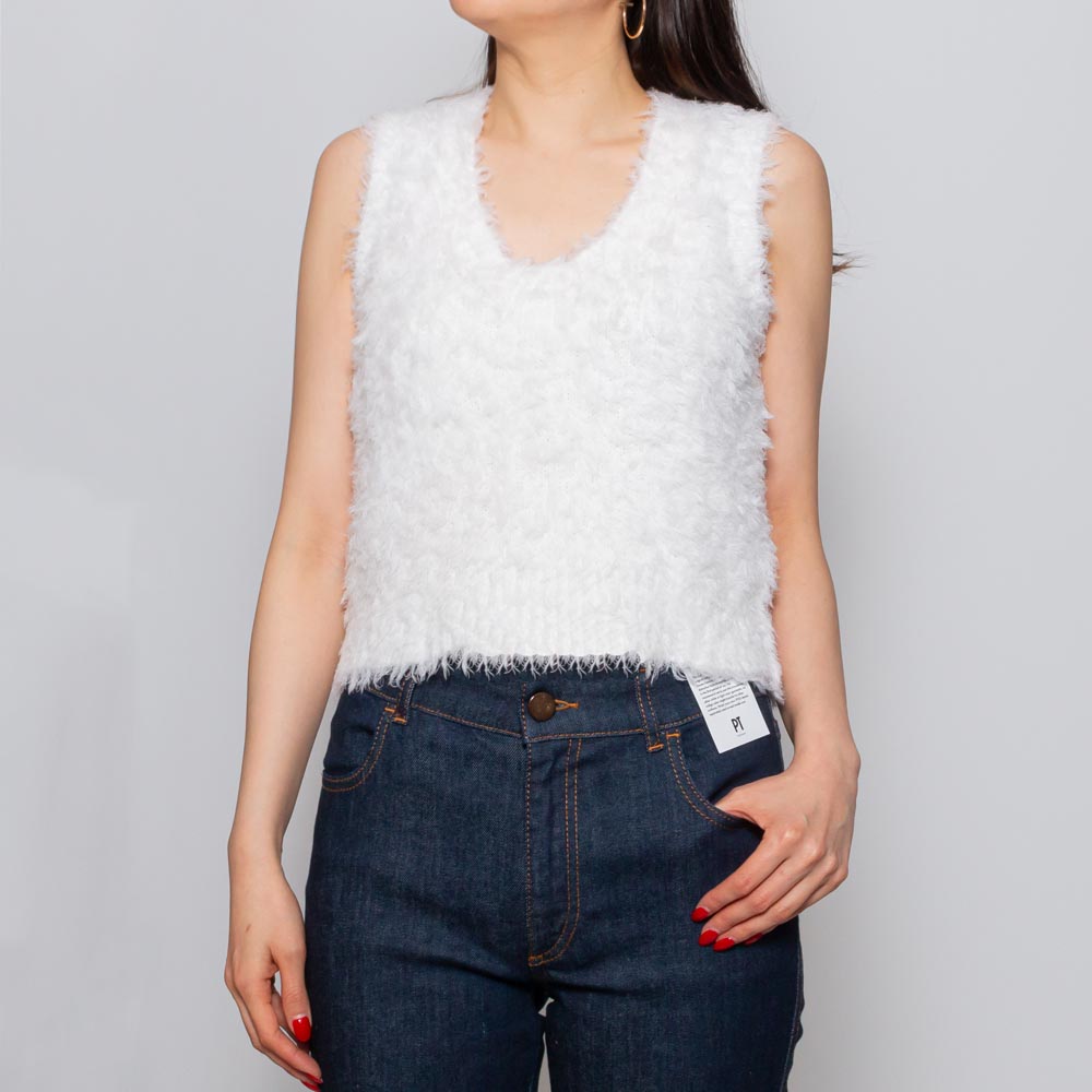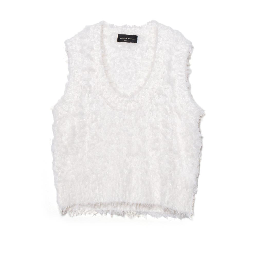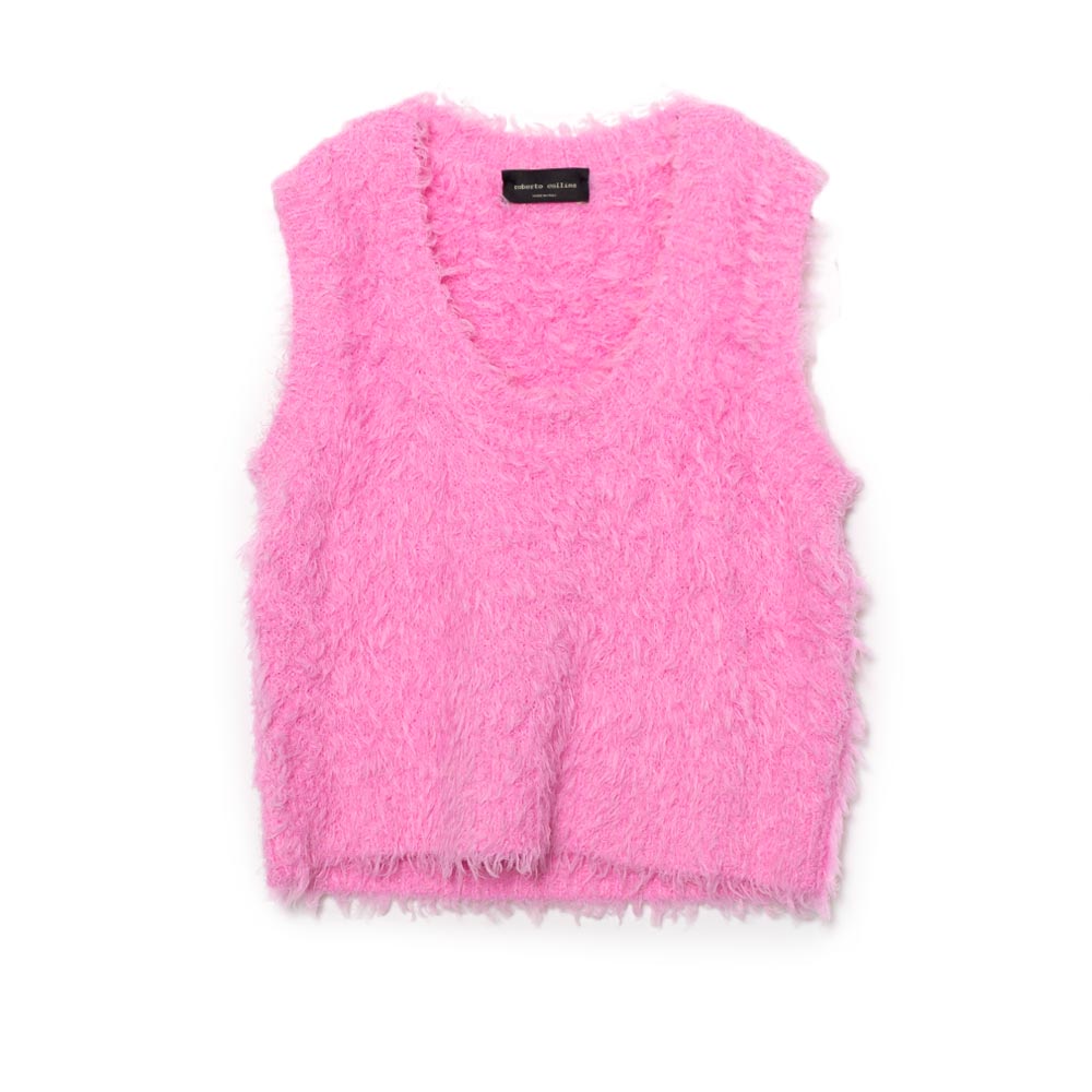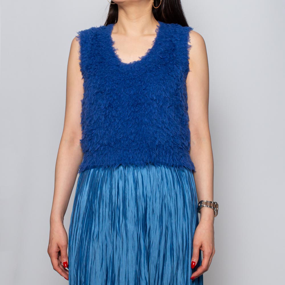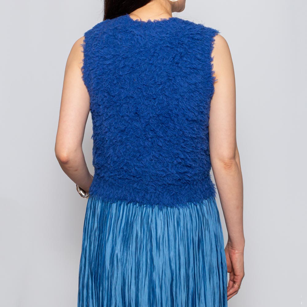 ほっこりとした素材感はコンパクトなフォルムとノースリーブで仕上げることで、着膨れをカバーしすっきりとした見え方に。