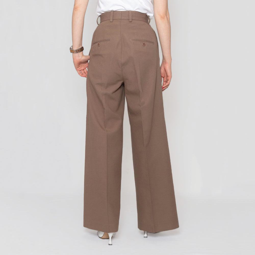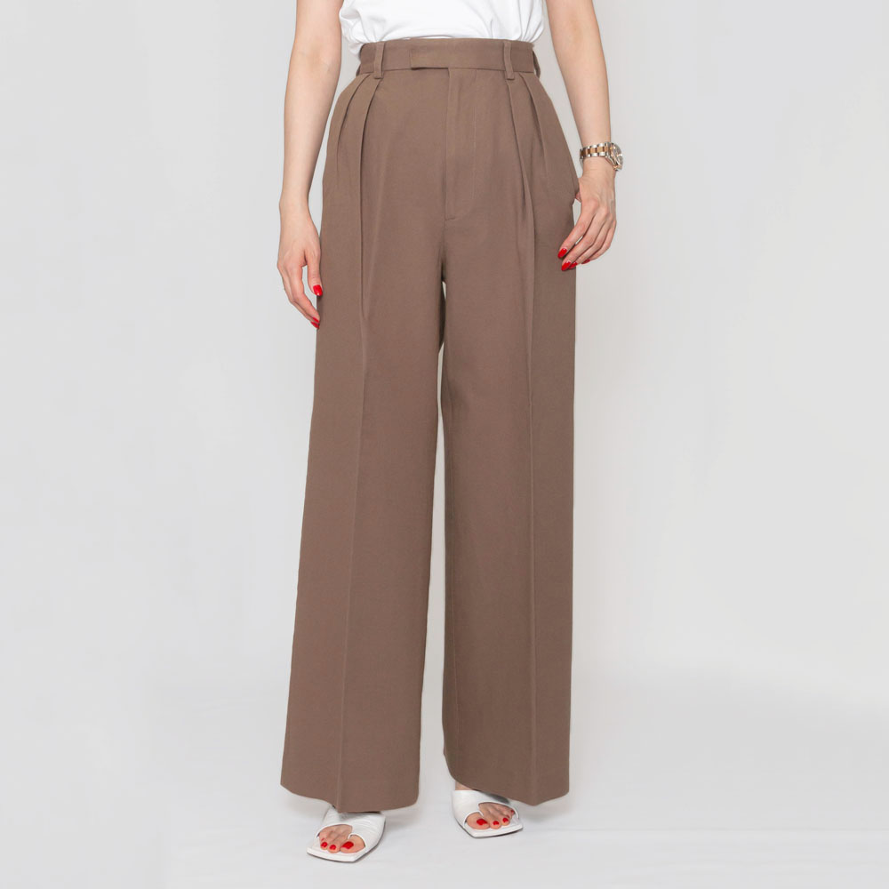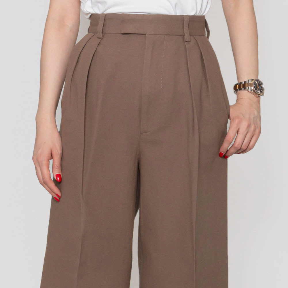 タックのデザインが施され、深い股上が脚長効果を発揮し、まっすぐで直線的なシルエットが美しいレッグラインを演出します。