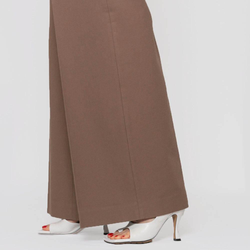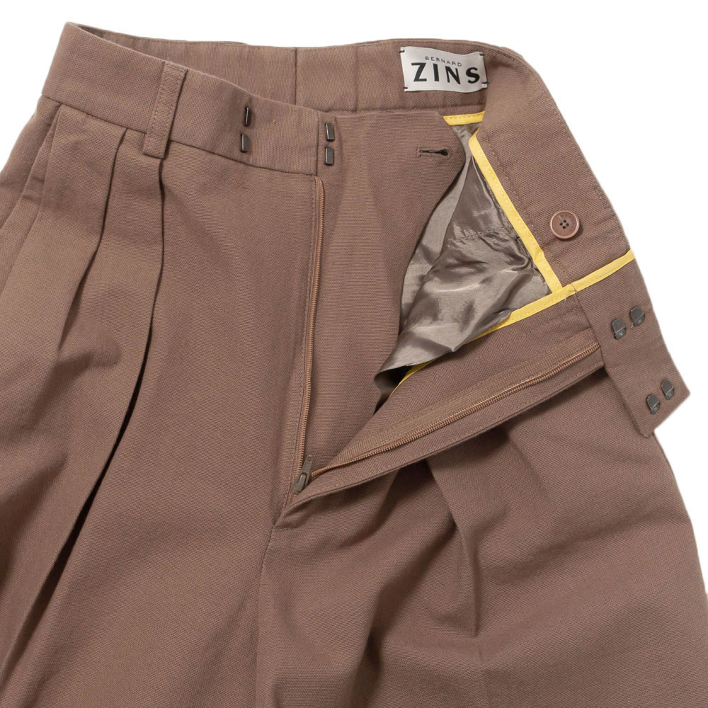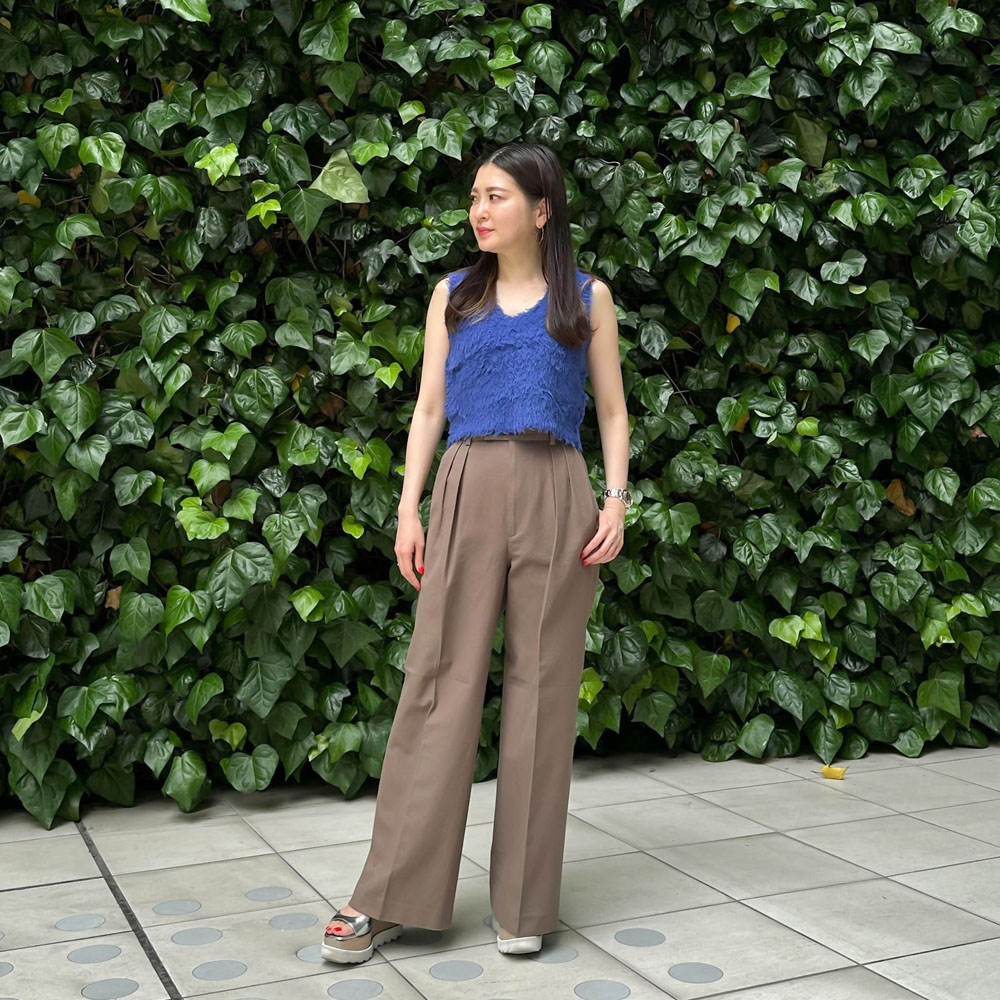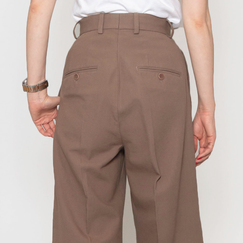 タックのデザインが施され、深い股上が脚長効果を発揮し、まっすぐで直線的なシルエットが美しいレッグラインを演出します。