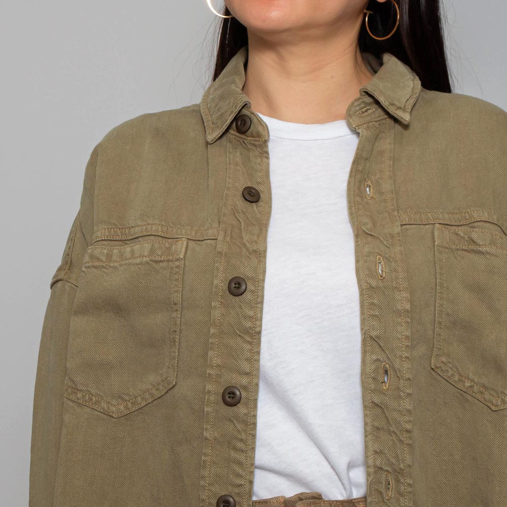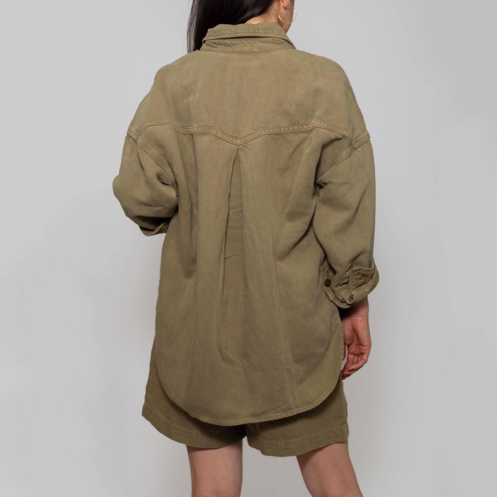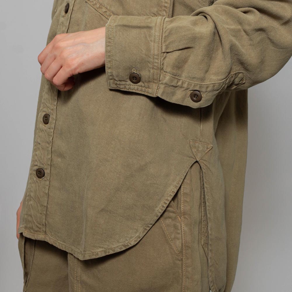 ドロップショルダーとラウンドにカットされた裾は、ワークシャツならではの抜け感を演出。