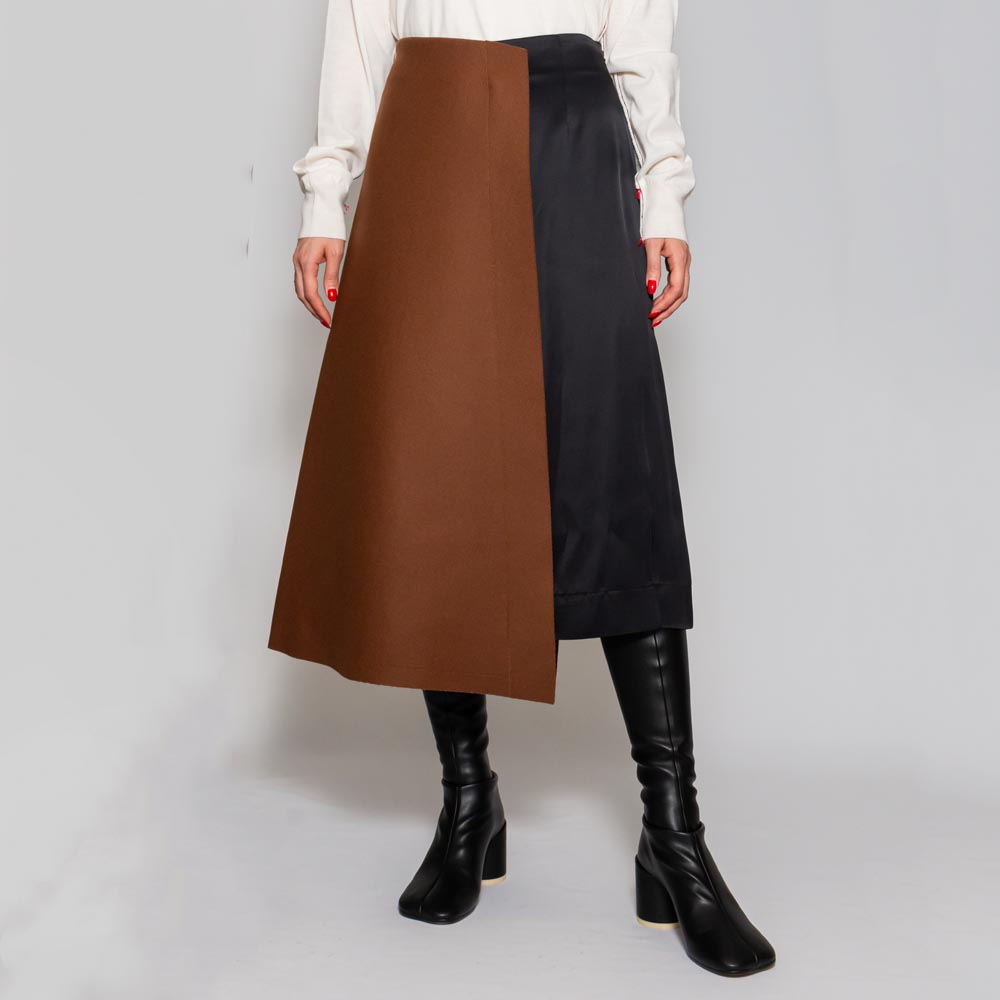異なる生地を組み合わせたバイカラーのスカート。