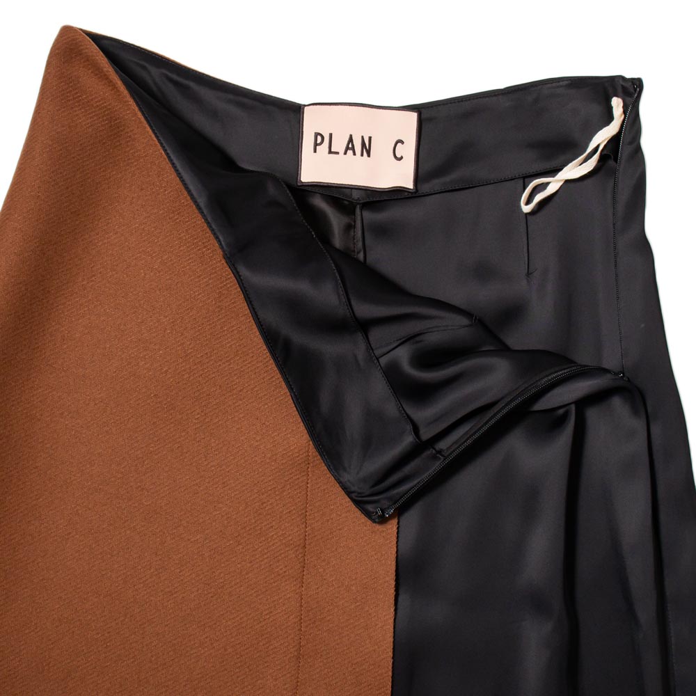 ブラウンの生地はウール75%とナイロン25%をブレンドし、アウターで採用している生地をスカートに使用しました。