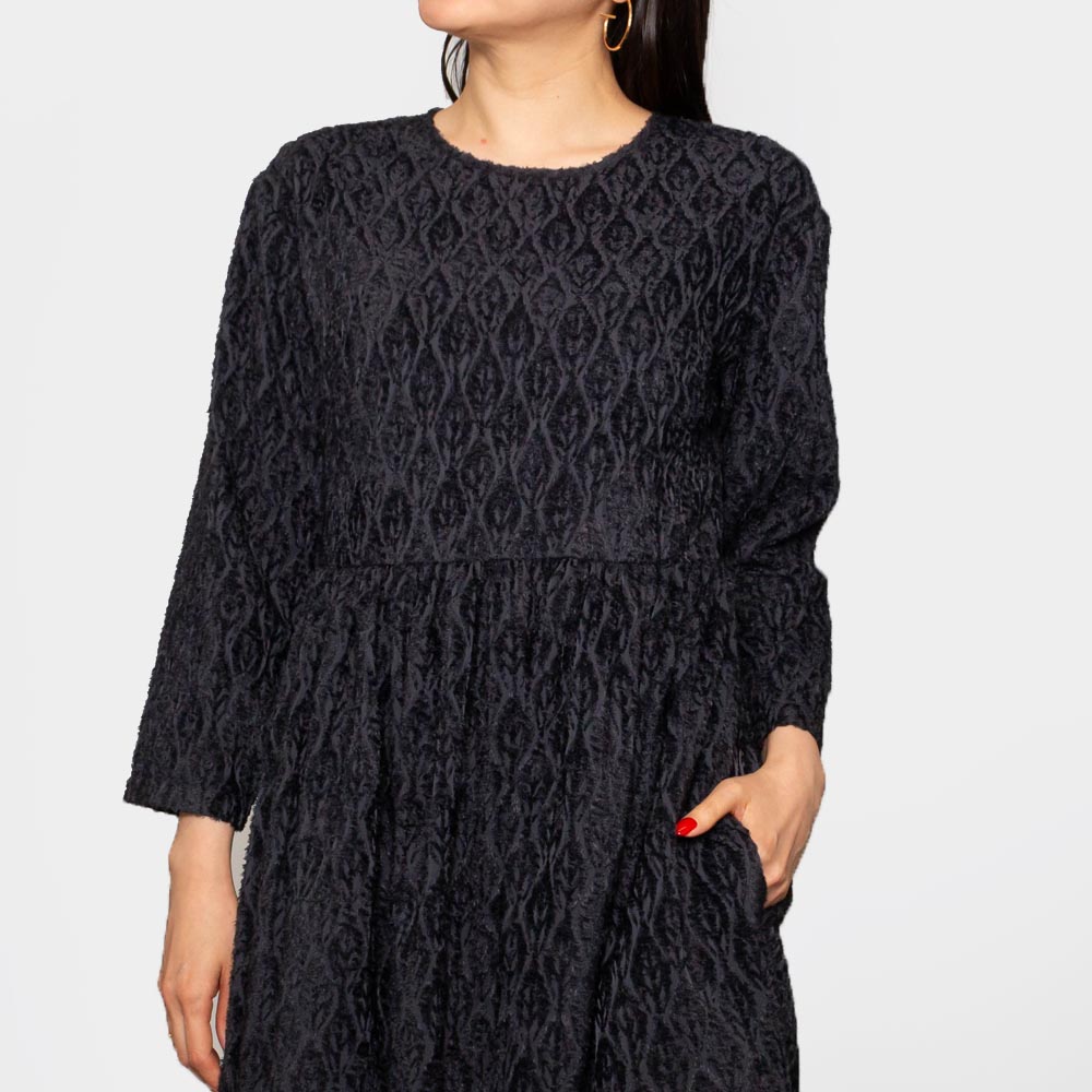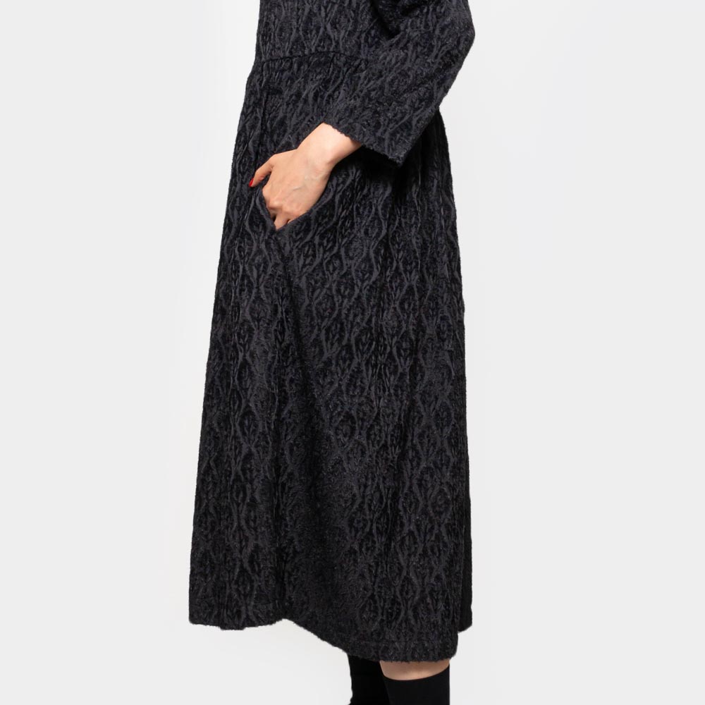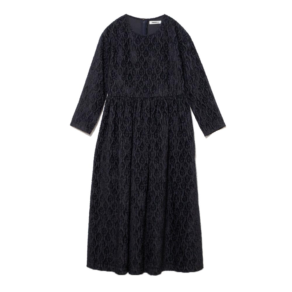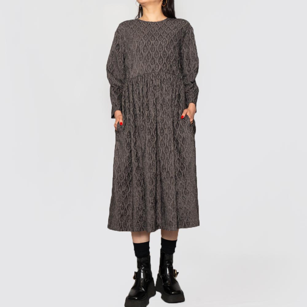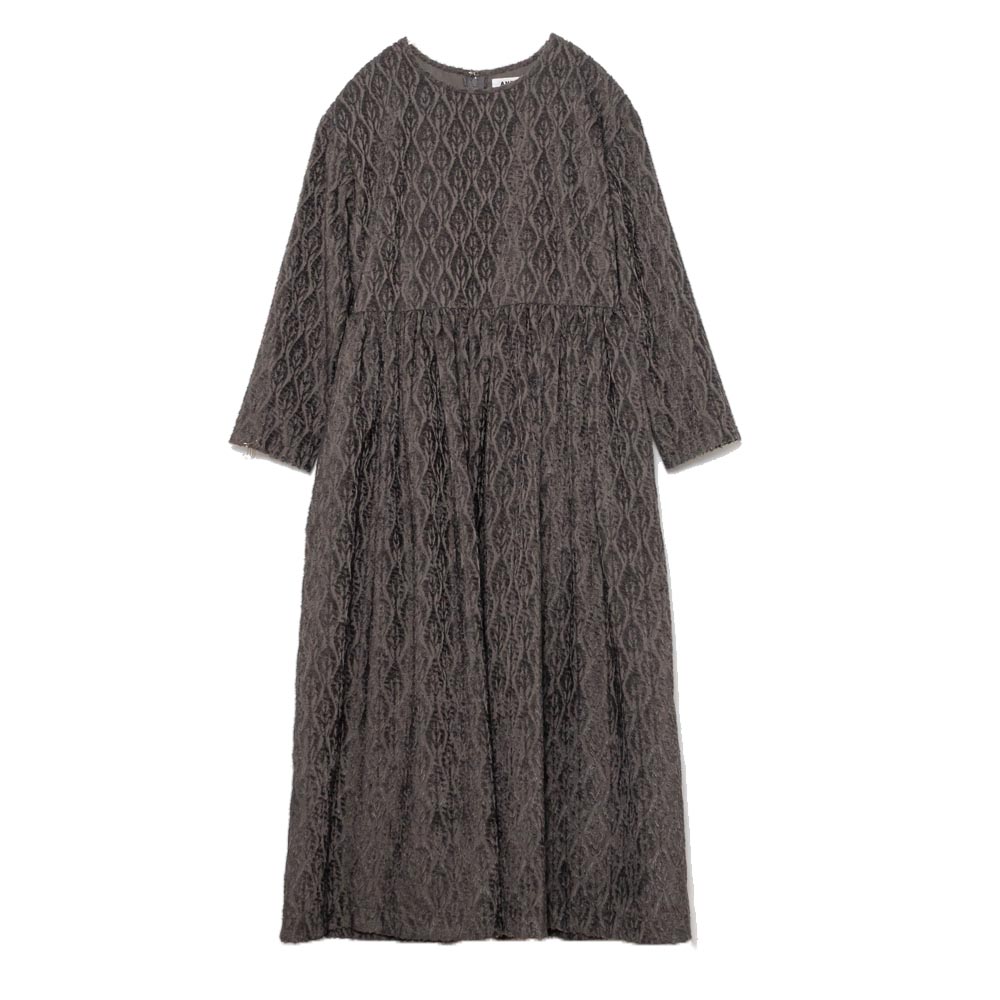 カットジャガード生地を使用したクルーネックのワンピース。