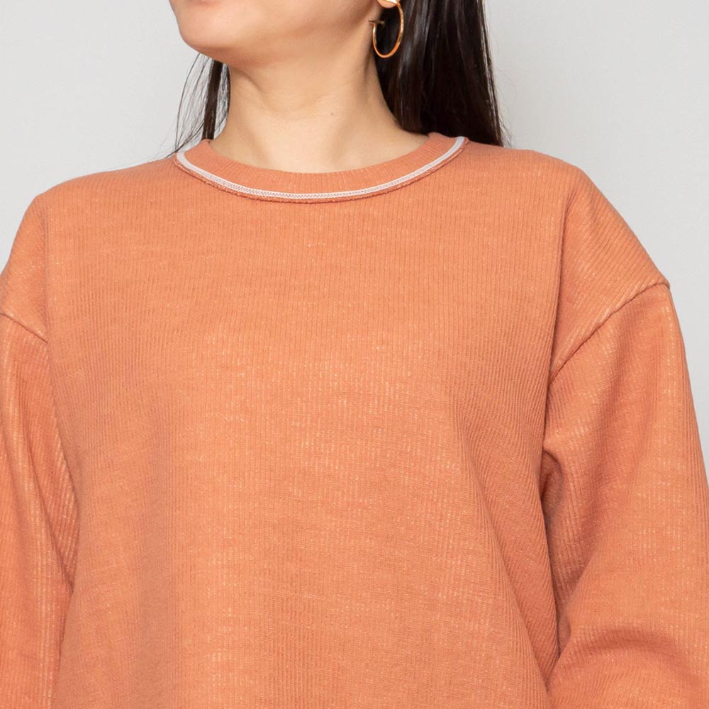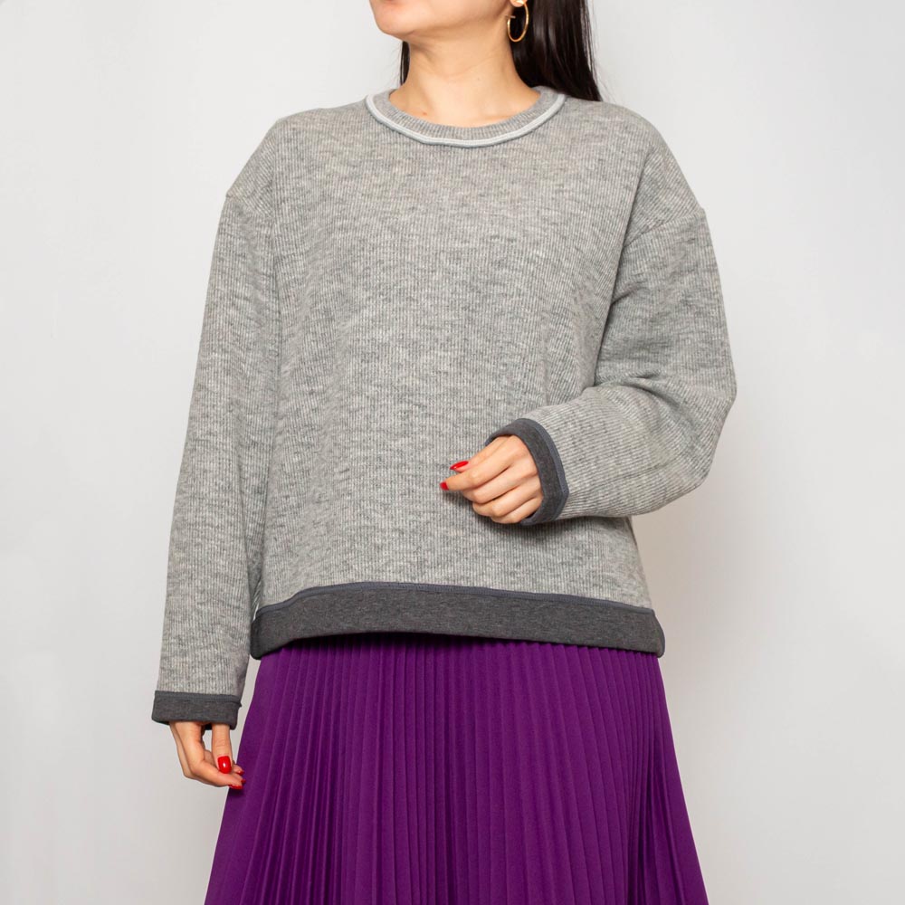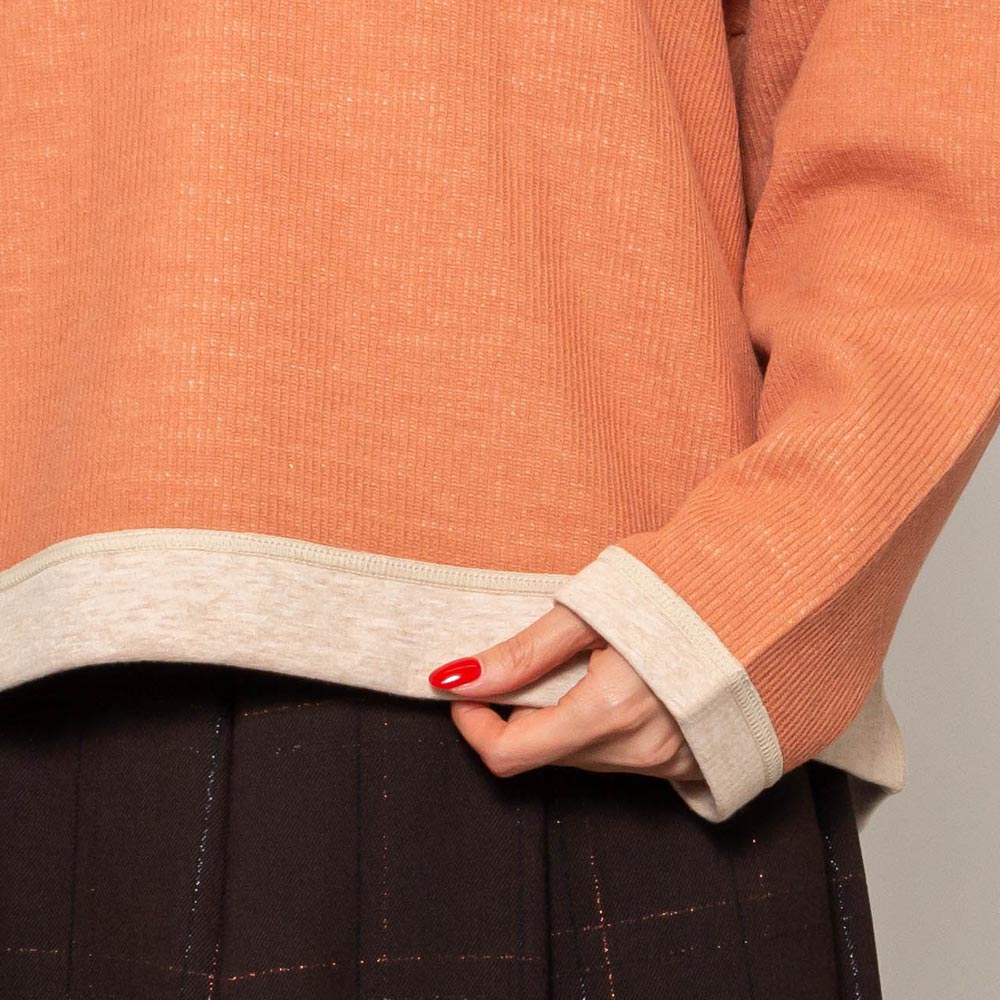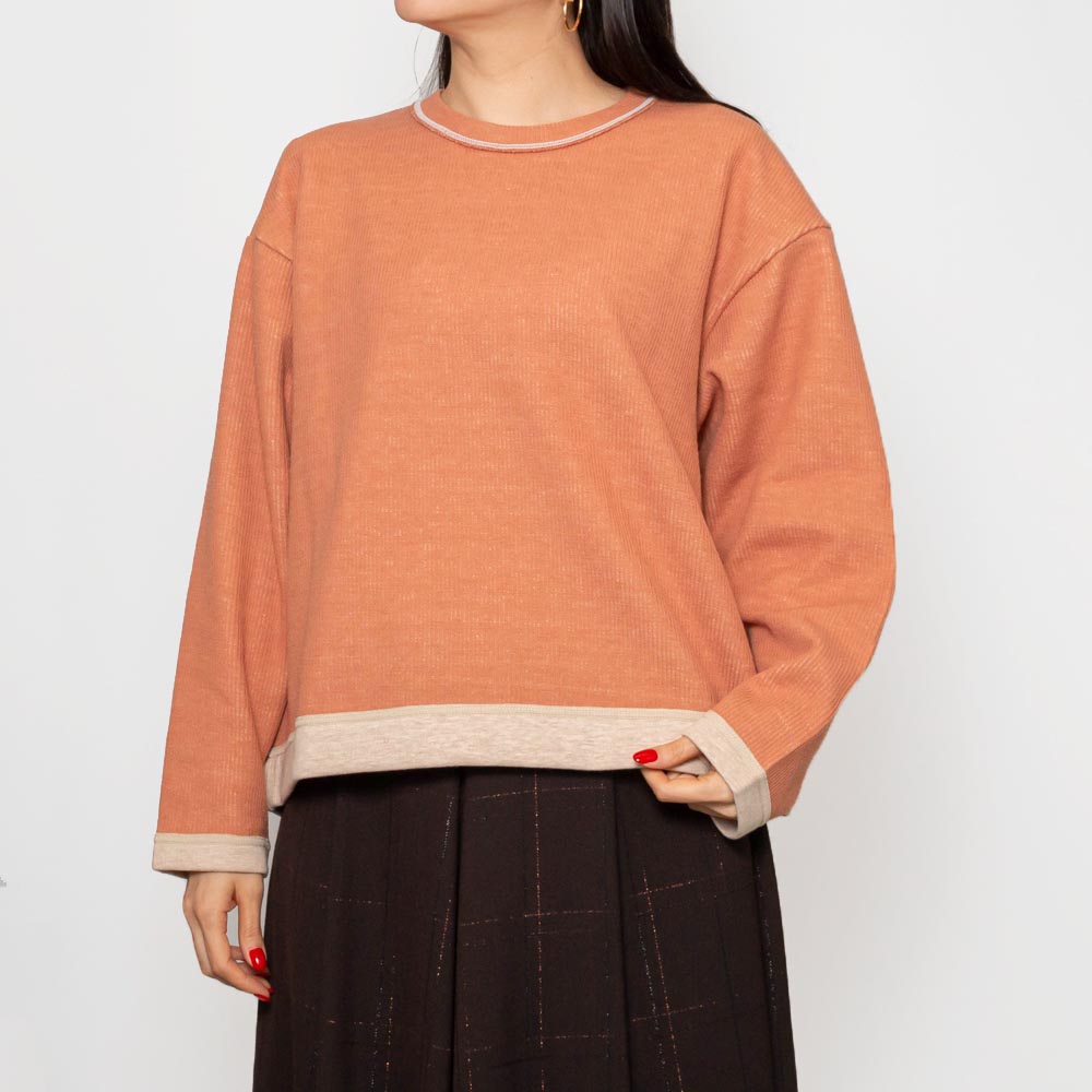 切り替えデザインでダブルフェイスの異なる風合いを楽しめるクルーネックのトップス。
