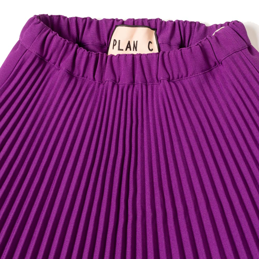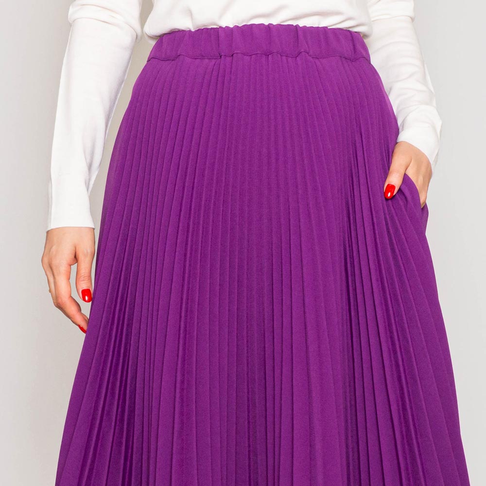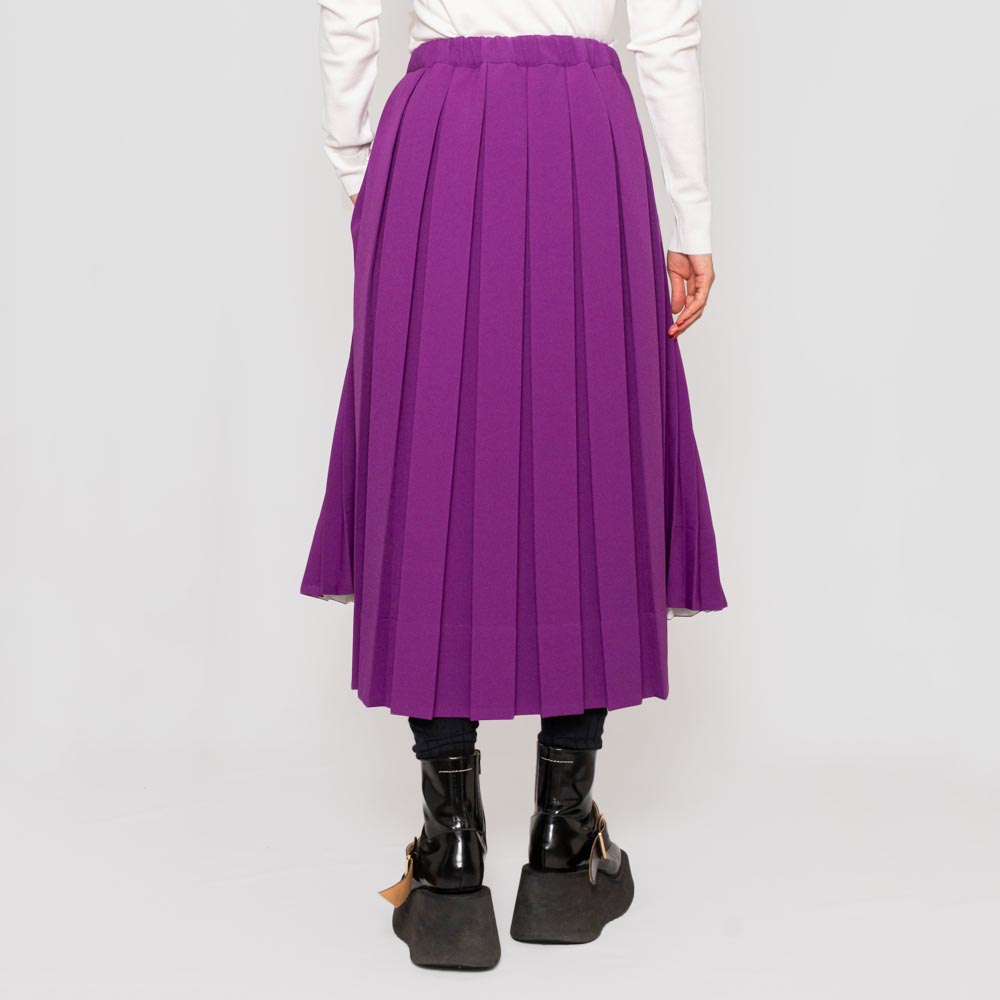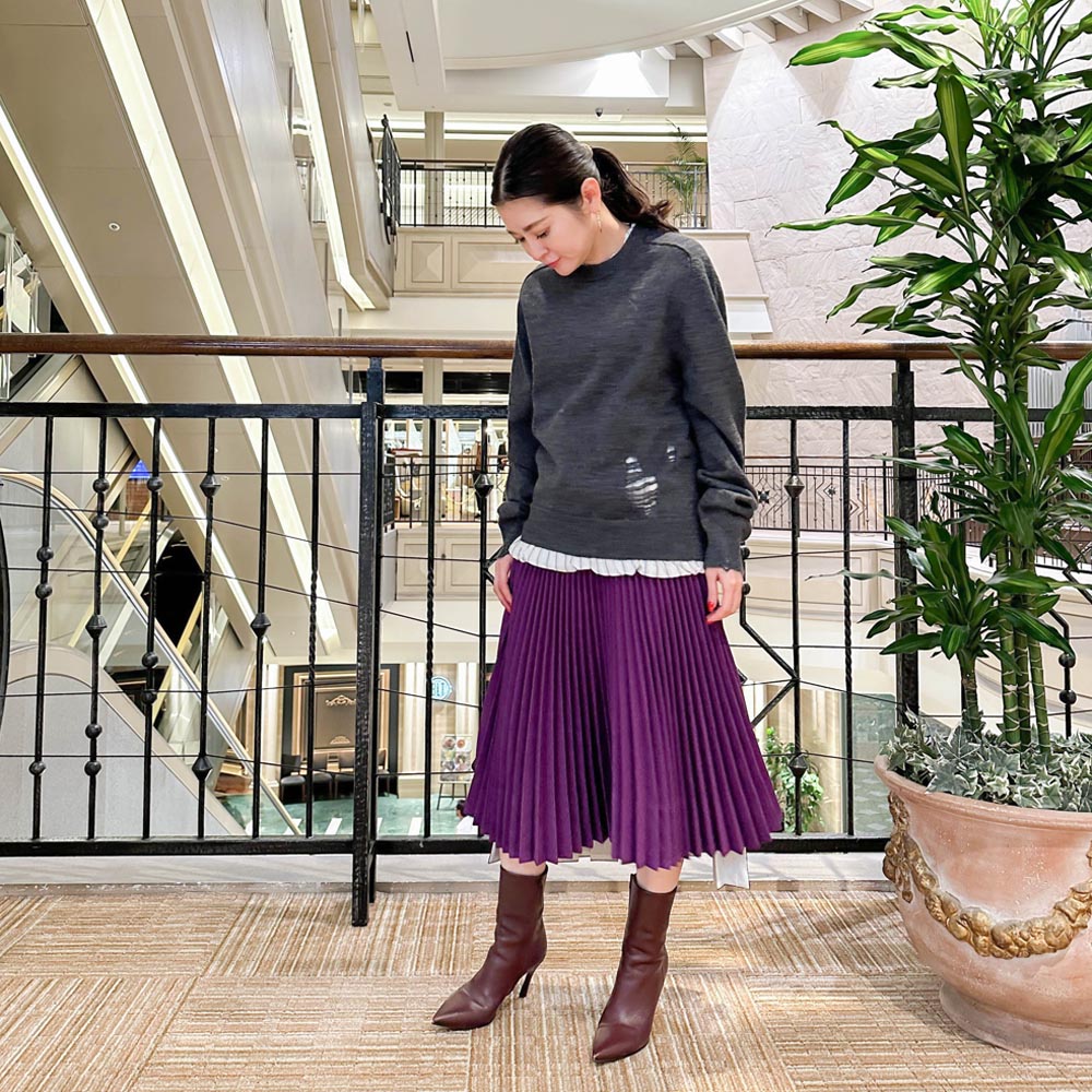 異なるプリーツのデザインを巧みに組み合わせた、ミモレ丈のスカート。