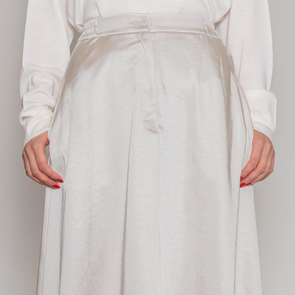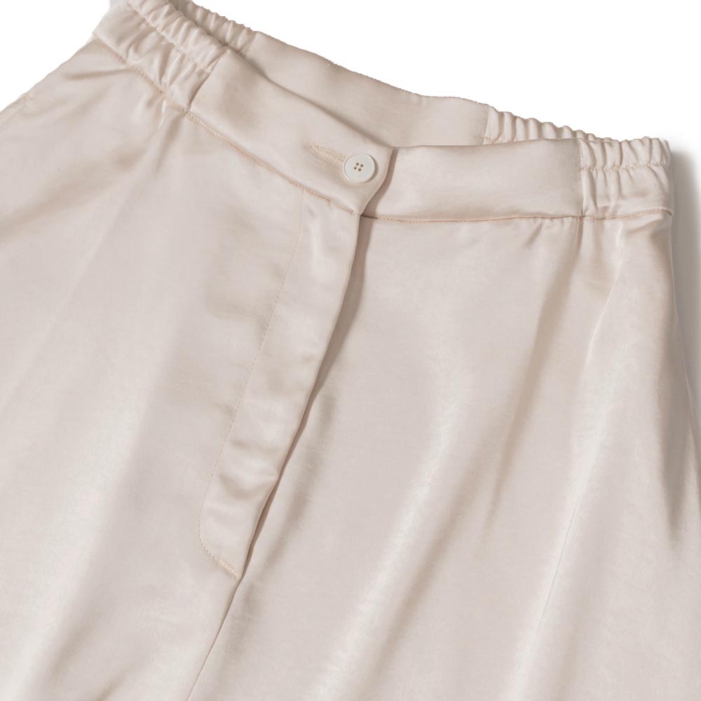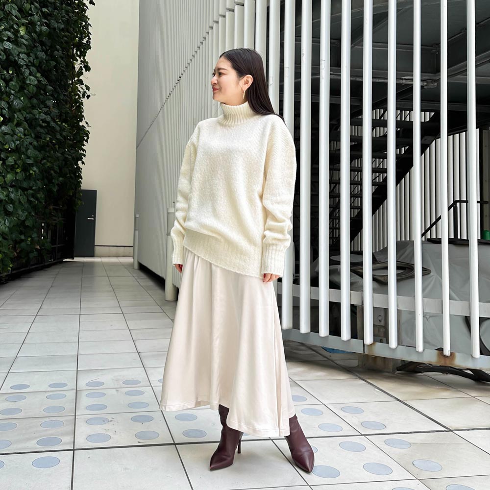 柔らかく落ち感のある生地がシルエットの広がりを落ち着かせていて、ドレープを描きエレガントな印象を引き立てます。