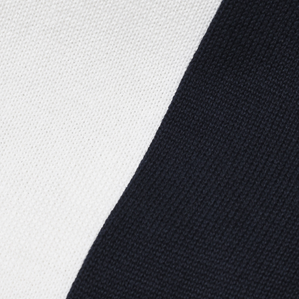 袖や裾、首元をバイカラーでアシンメトリーに仕上げ、シンプルな中にも控えめな個性を楽しめる一枚。