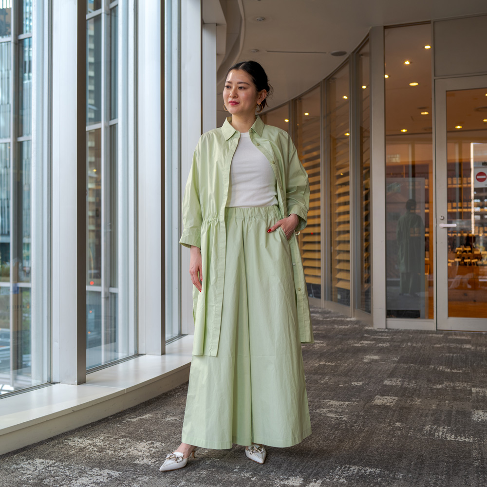体型をカバーしてくれるデザインですが更に腰位置が高く見えるように広がり方を調整し、袖の長さにもこだわりました。