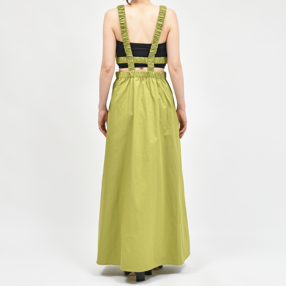 ウエスト部分はゴムシャーリングのギャザーが連なり、ウエストを繊細に引き締めます。