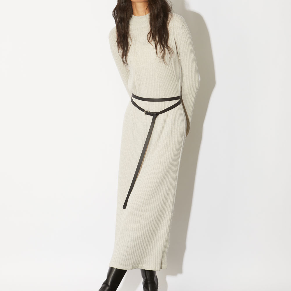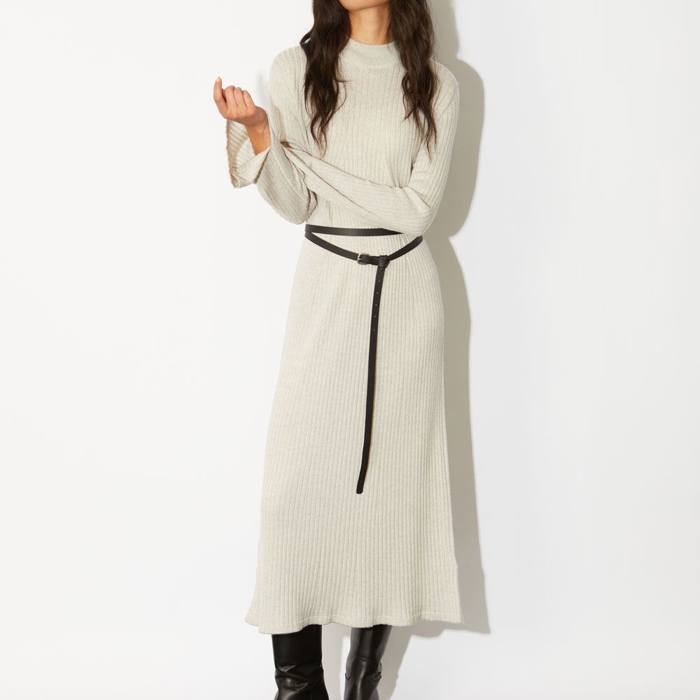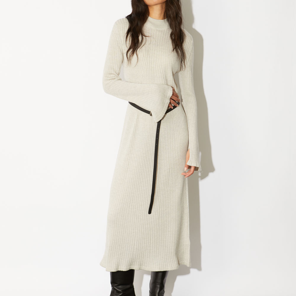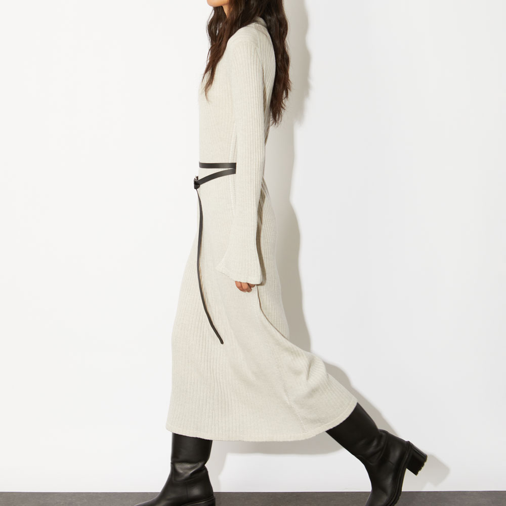やや厚手の生地感のリブ編みにエレガントなフレアシルエットが印象的なロングワンピース。袖と裾にスリットを入れることによって動きが生まれ華やか且つ華奢な印象を与える効果があります。