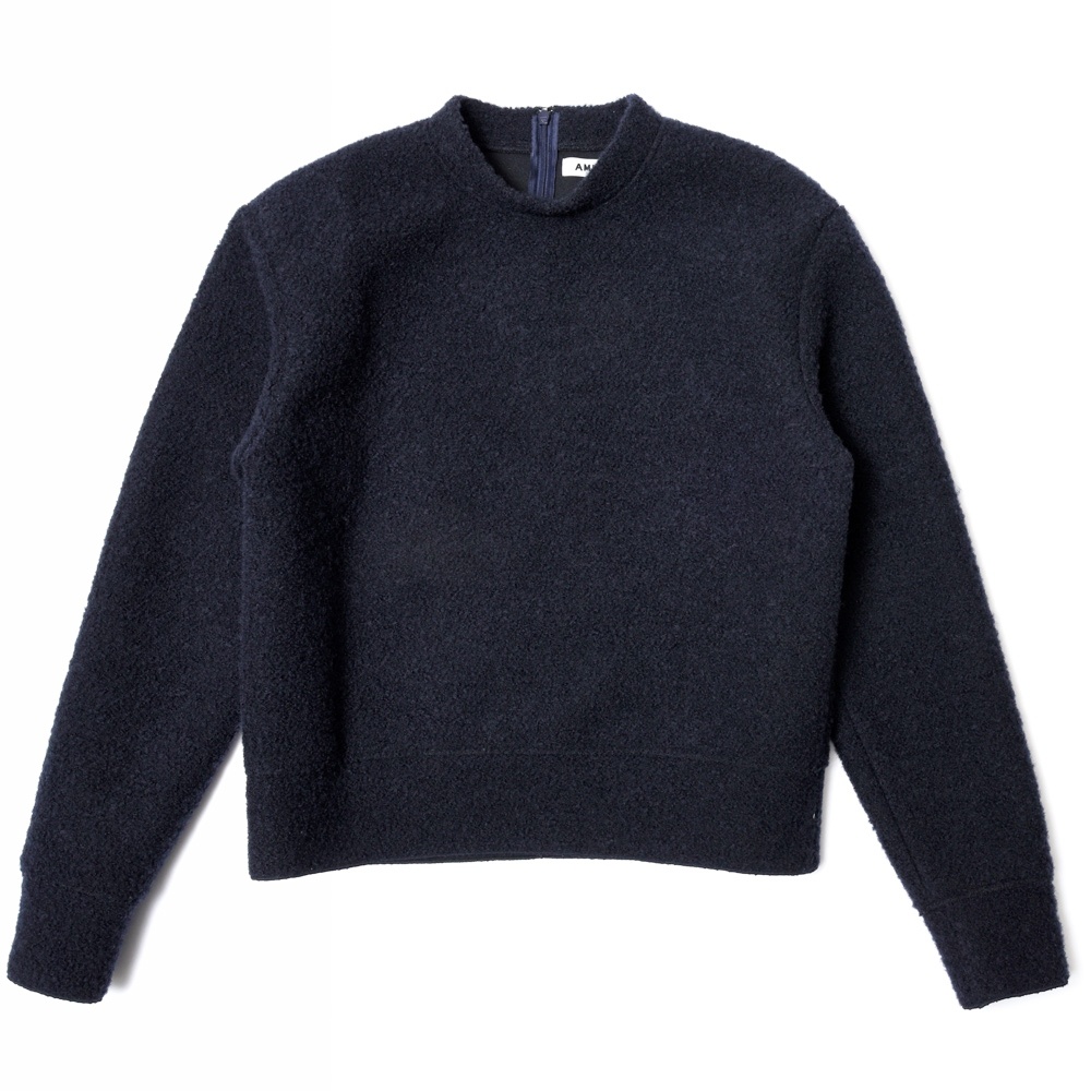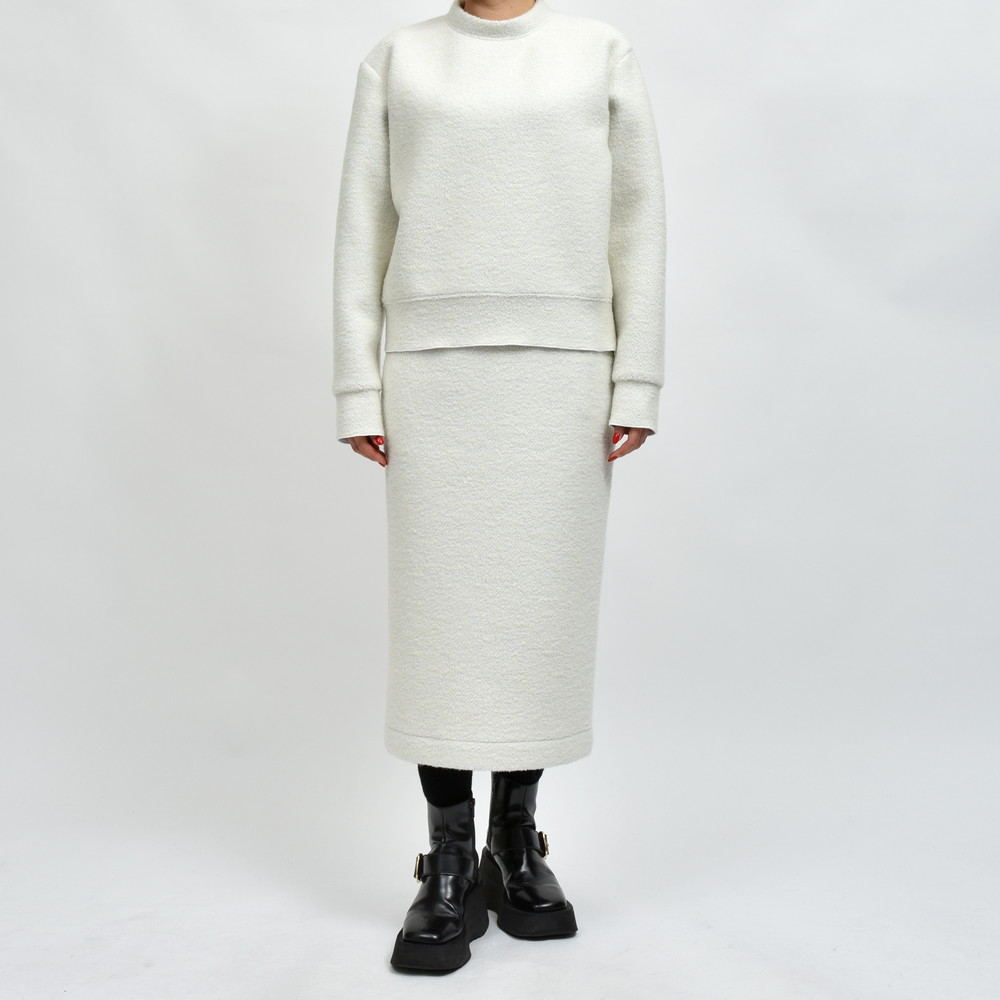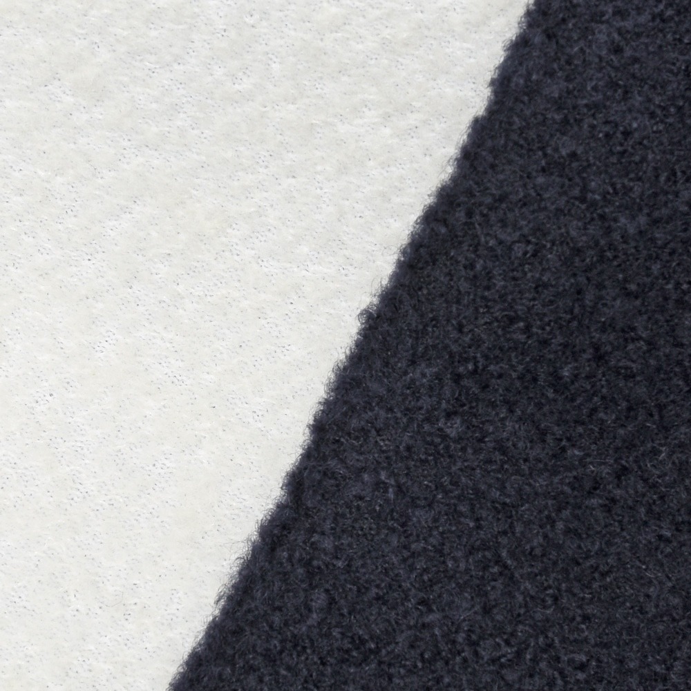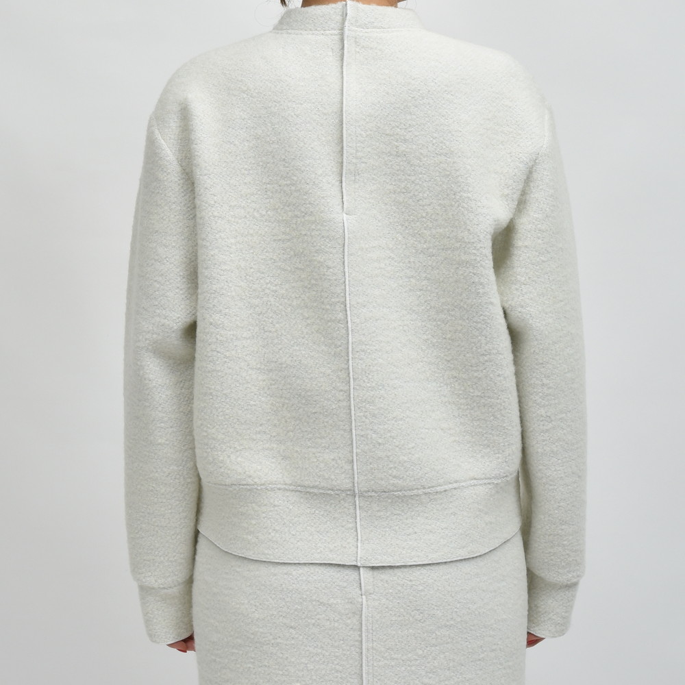 表地はブークレニット、裏には成型性を高め型崩れせず、ストレスなく着られるようキックバックを強めるためのフィルムをボンディング、見た目にも機能的にもスペシャルなクオリティを備えたファブリックを使用したプルオーバーニットです。