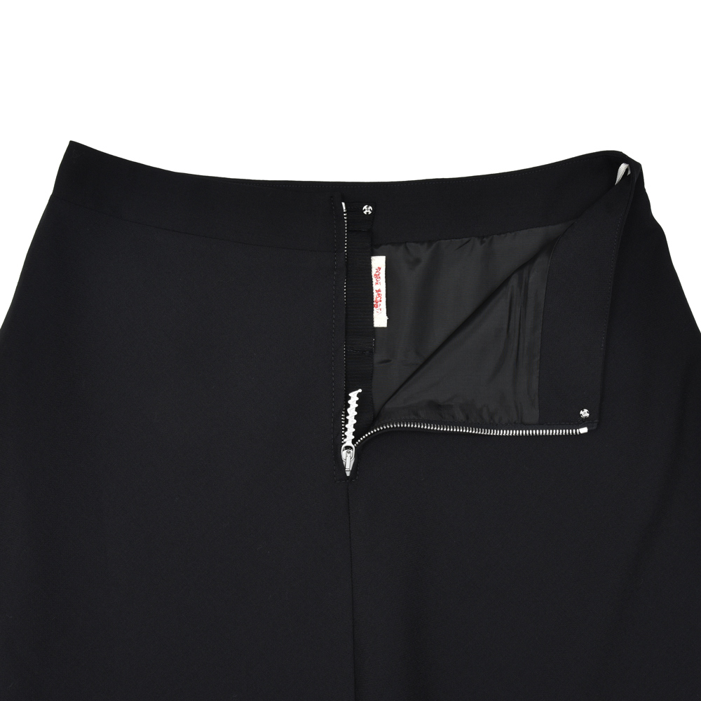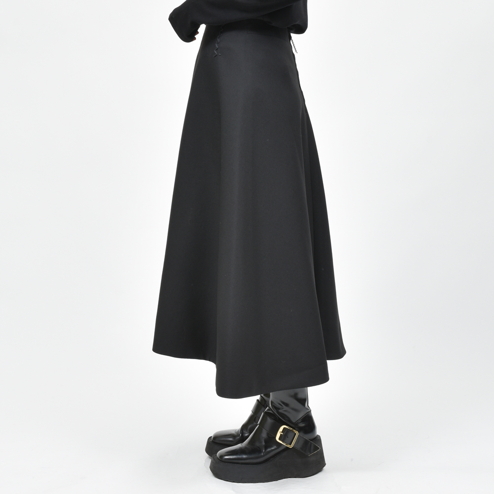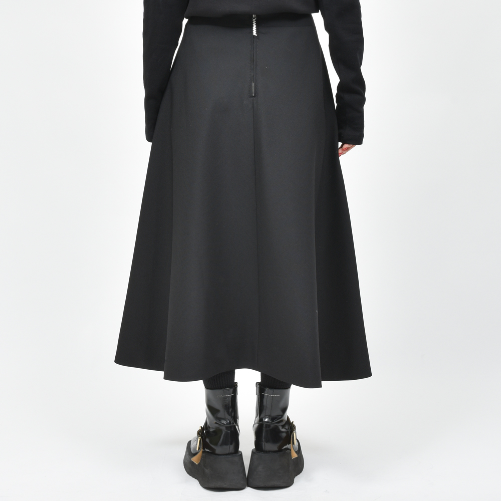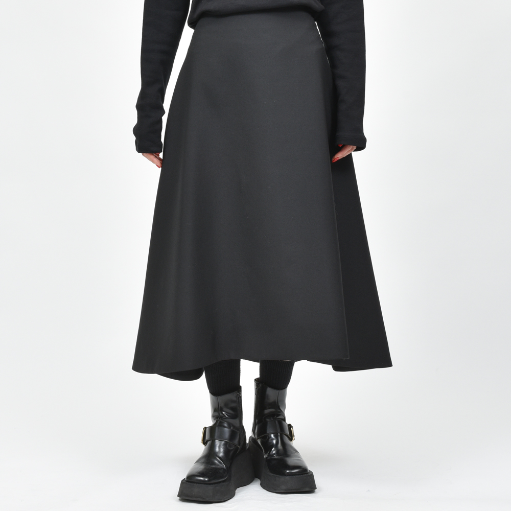 ブラックの色味で統一されたフレアスカート、上質なウール生地がもたらすドレープ感が印象的なアイテムになっています。同ブランドが得意とするバイカラーや柄ではなく単色になっているというのが今シーズンらしいところ。