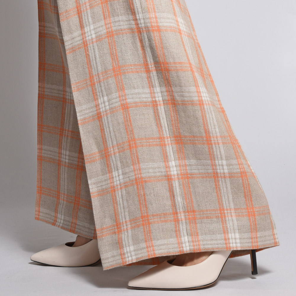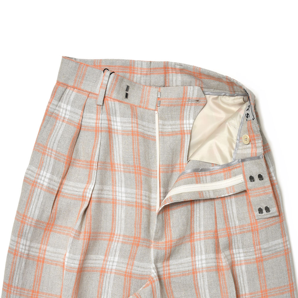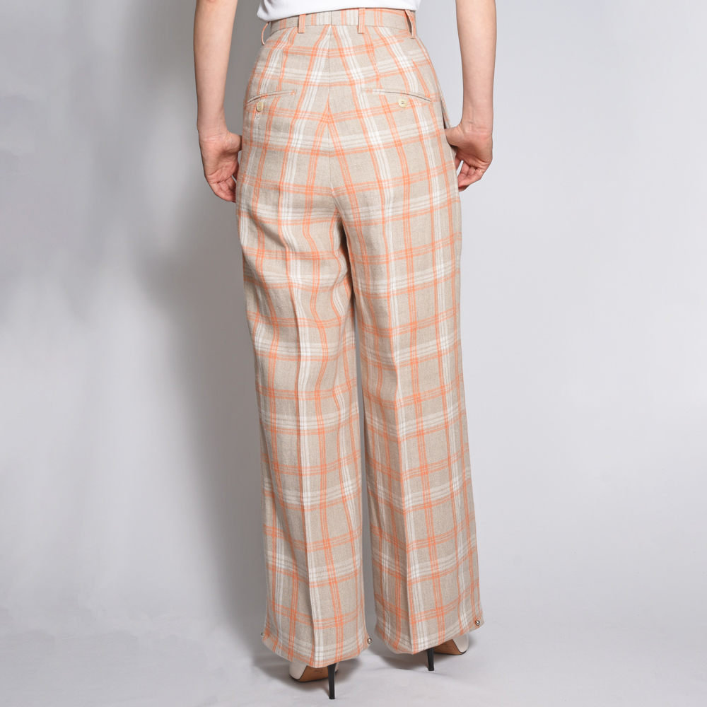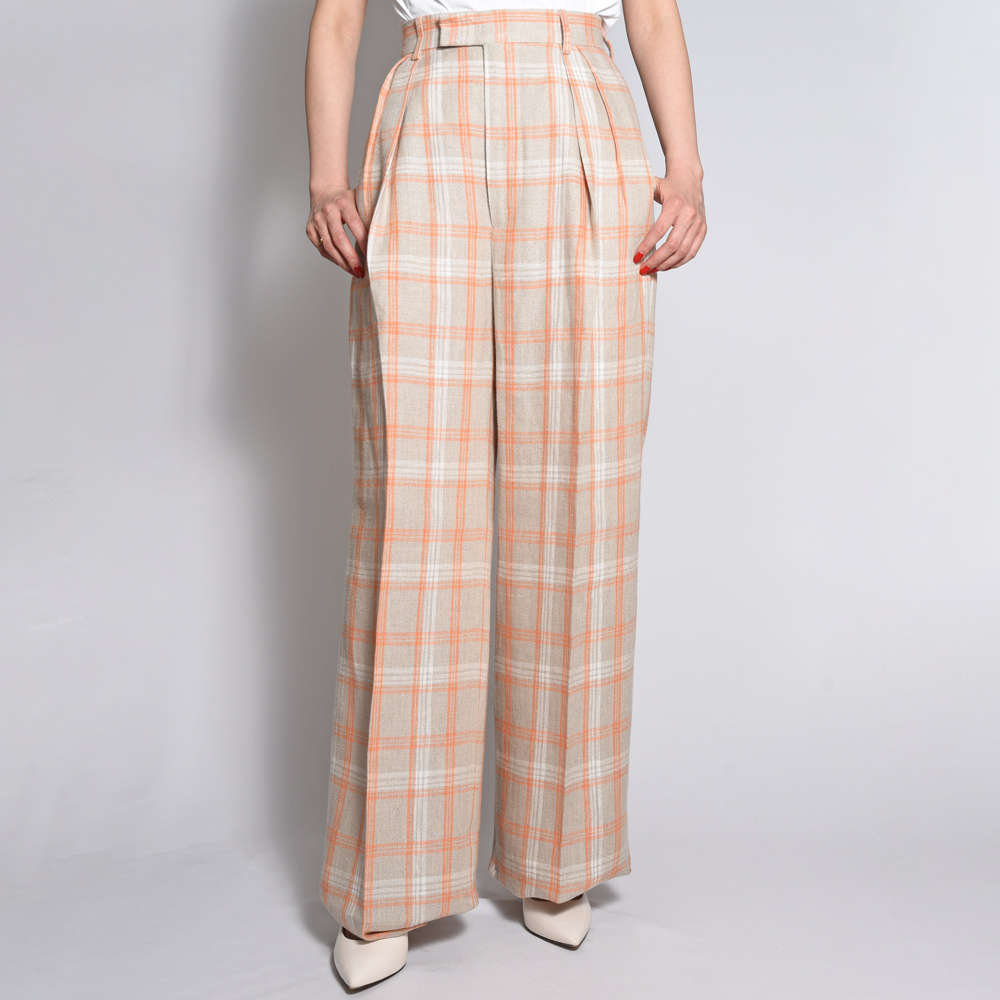 タックのデザインが施され、深い股上が脚長効果を発揮し、まっすぐで直線的なシルエットが美しいレッグラインを演出します。