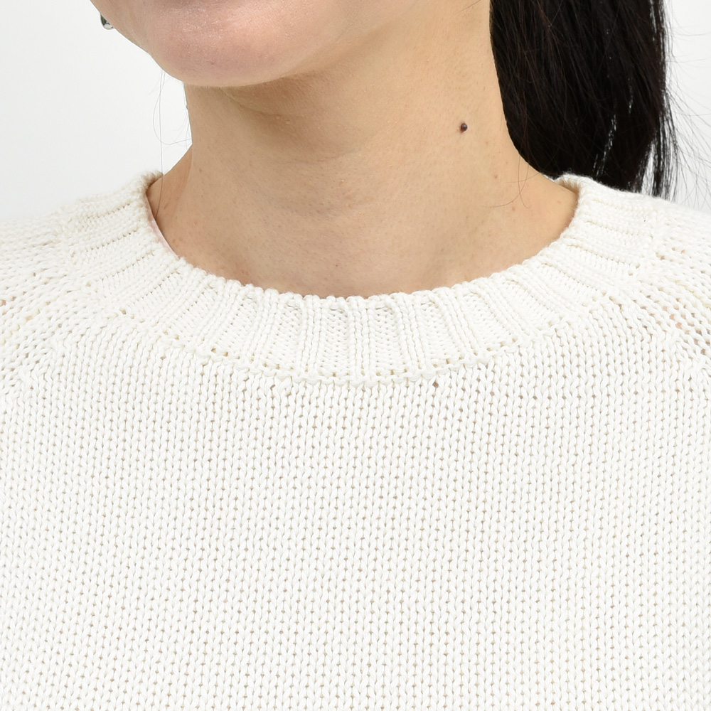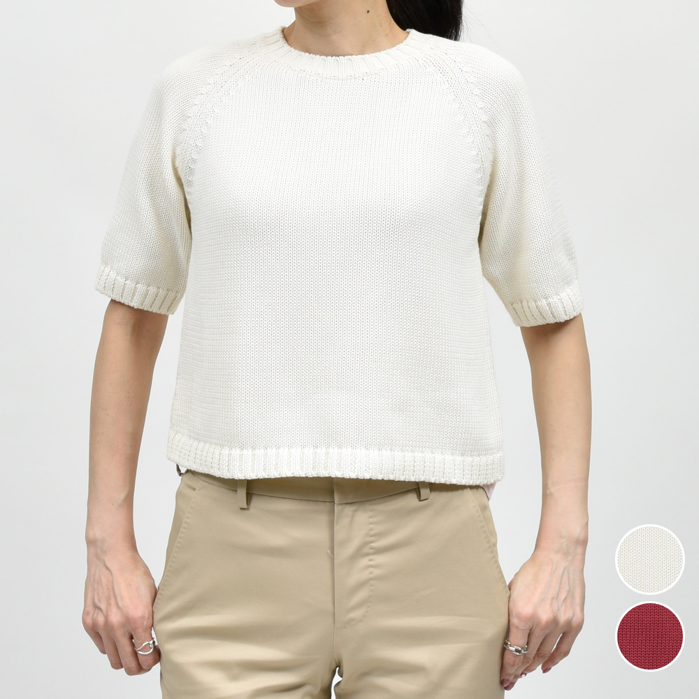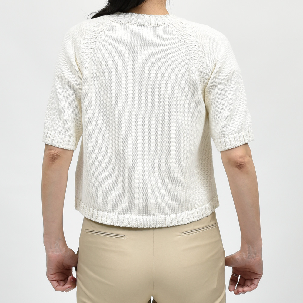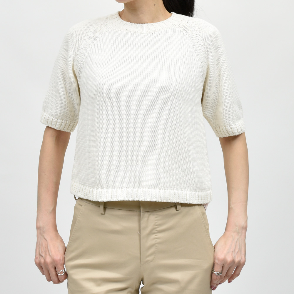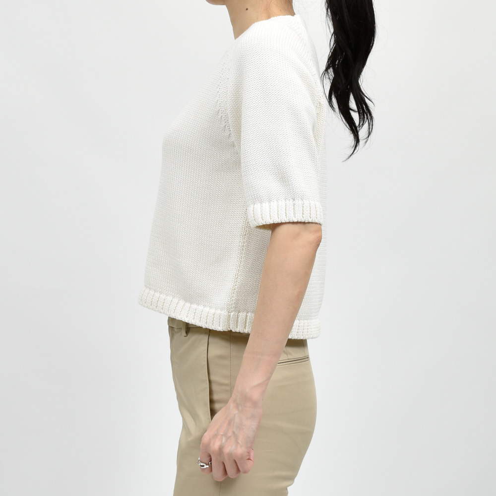 ミドルゲージのクロップド丈のショートスリーブニット、現代的なバランス感を持った一着になっています。
