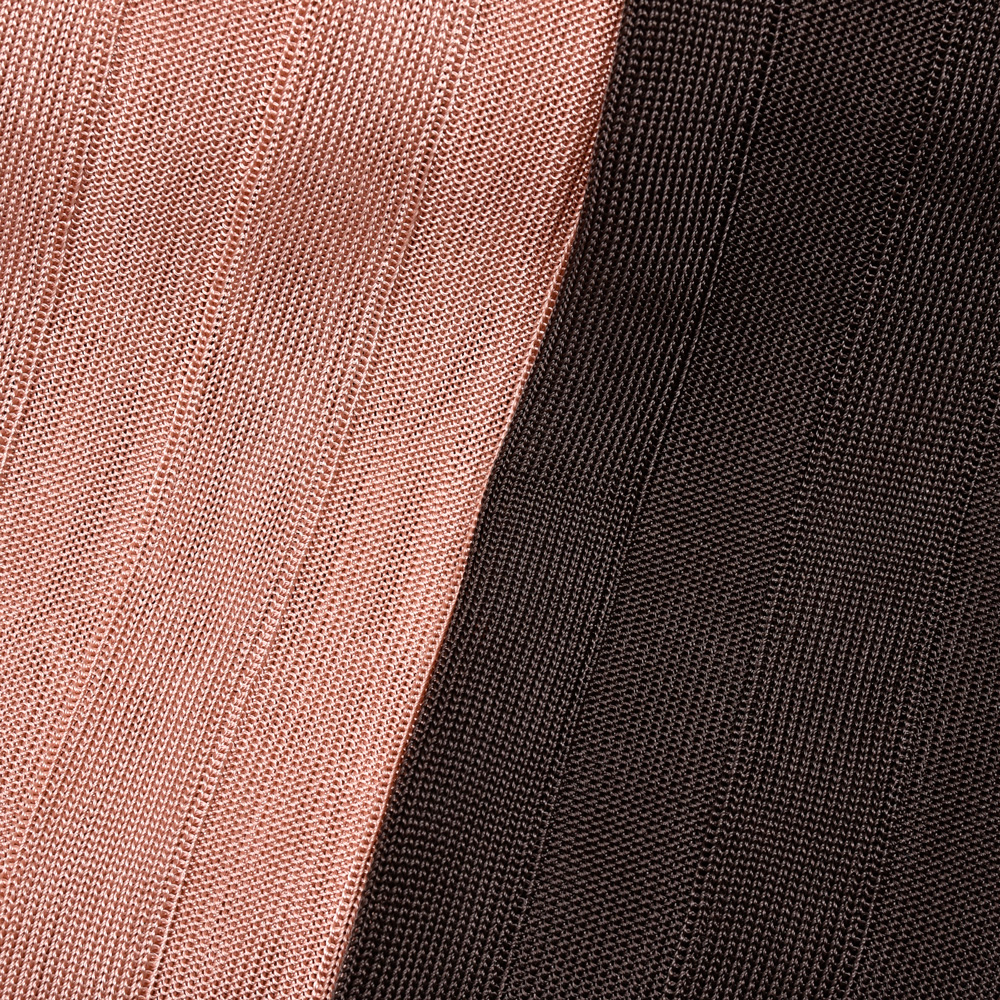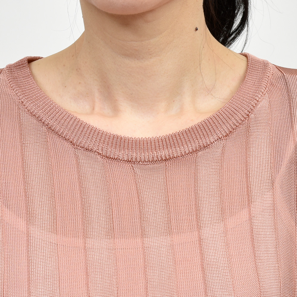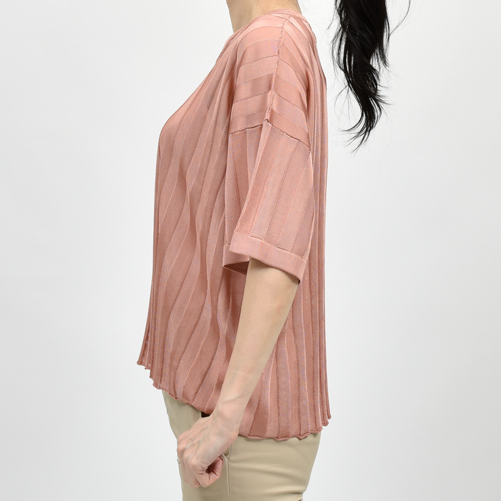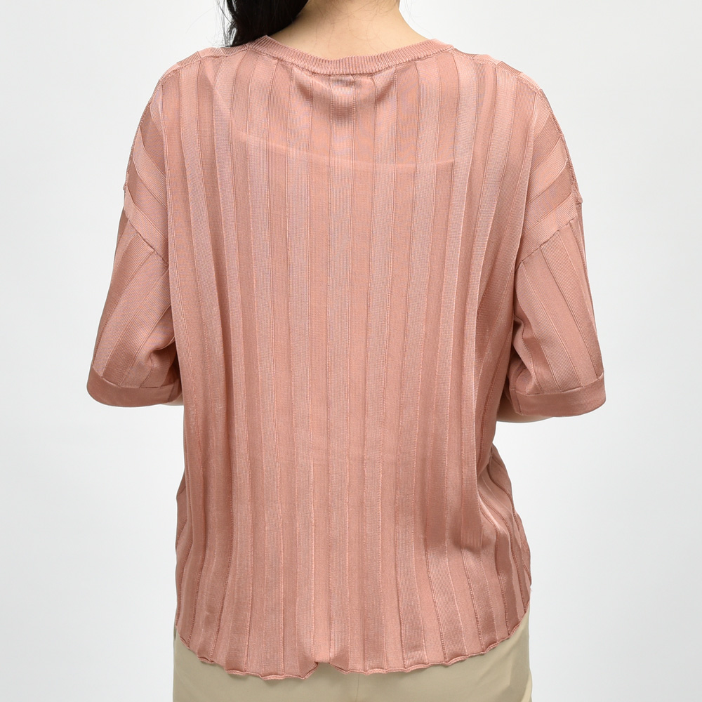 シアー感のあるリブニット、シルエットは肩を落としたリラックス感のあるタイプですがレーヨン素材と編み方によって独特のドレープを楽しめる一着になっています。