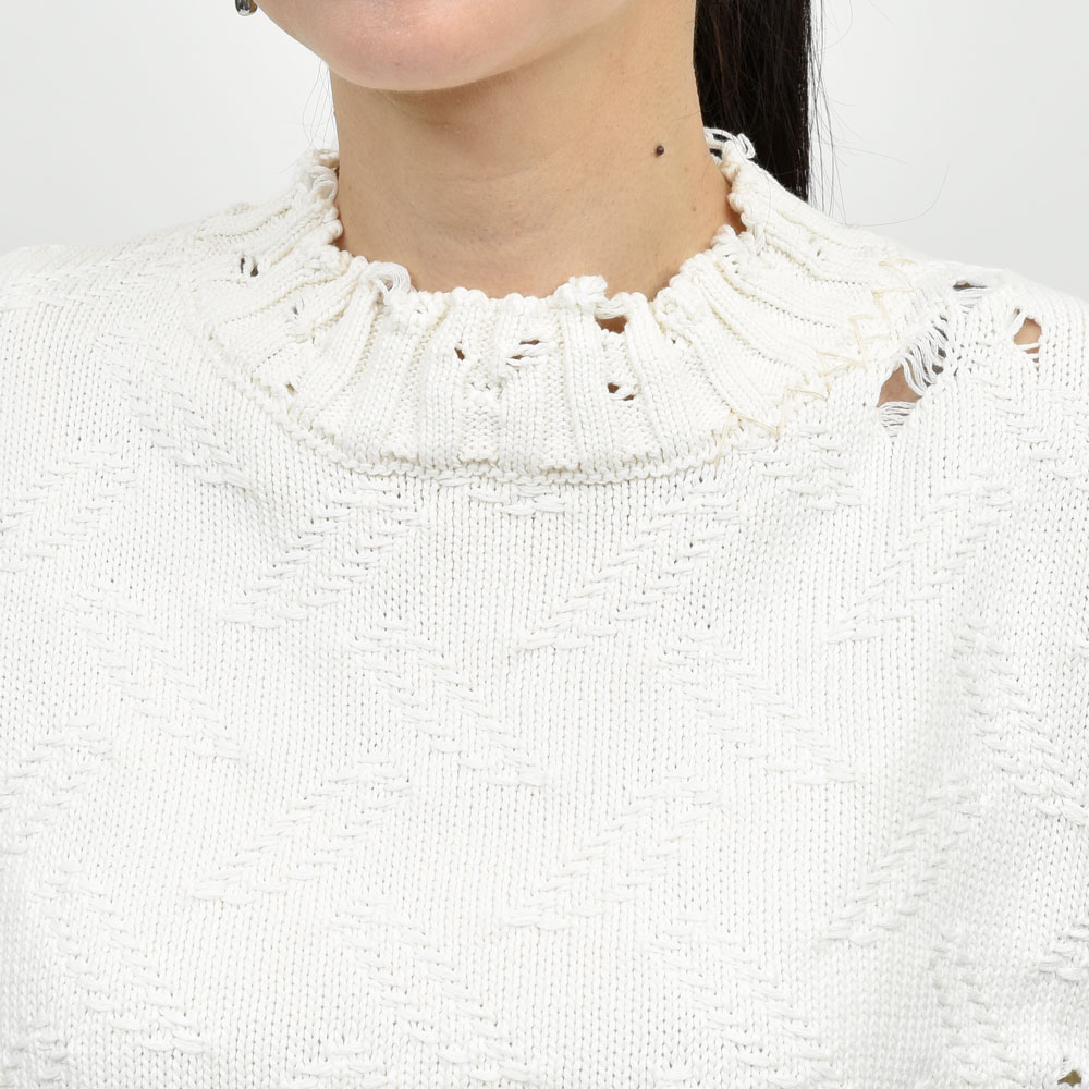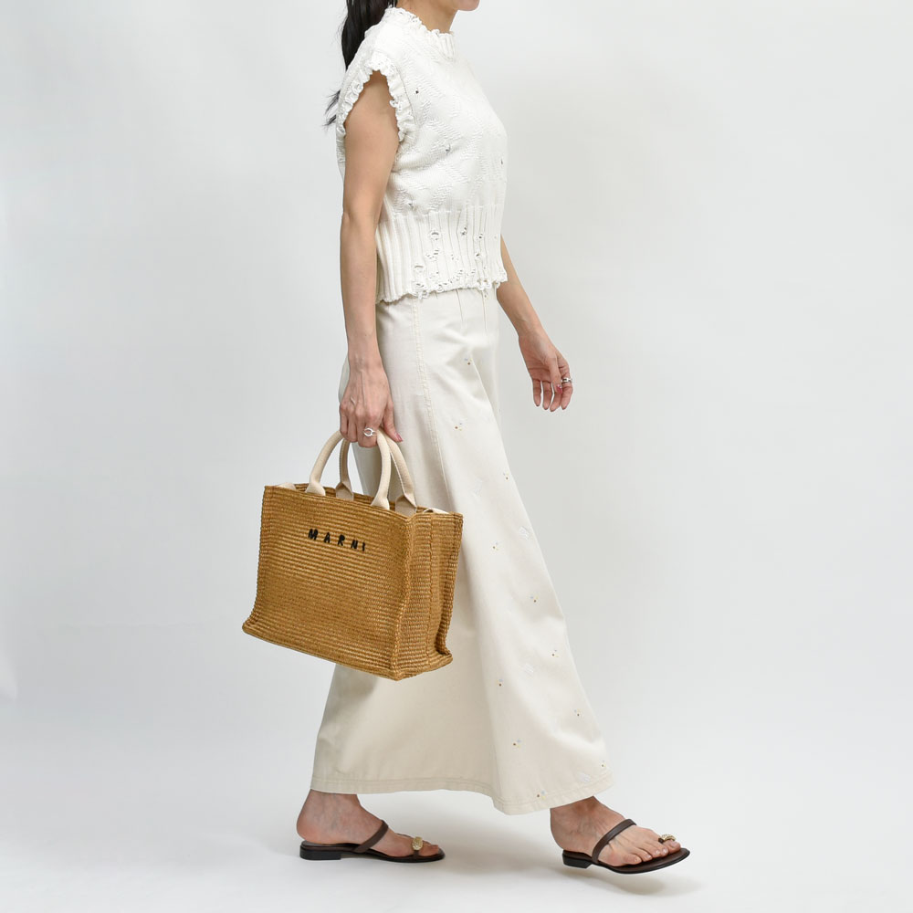 ダメージ加工を施したアイテム、MARNI(マルニ)では定番的なデザインになります。着丈はコンパクトに、身幅はややゆとりを、肩部分はキャップスリーブのデザインに、リブ幅も広めに取ることであえて洗練されすぎないような塩梅になっています。