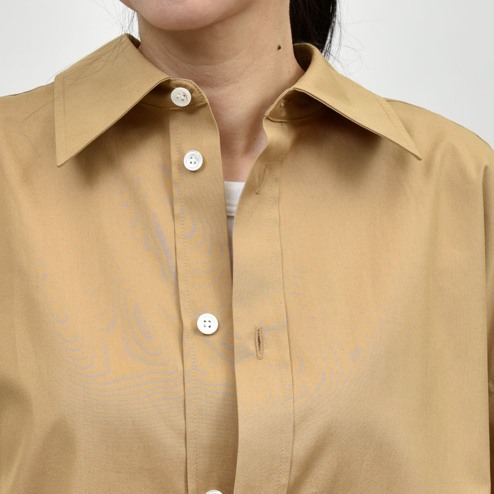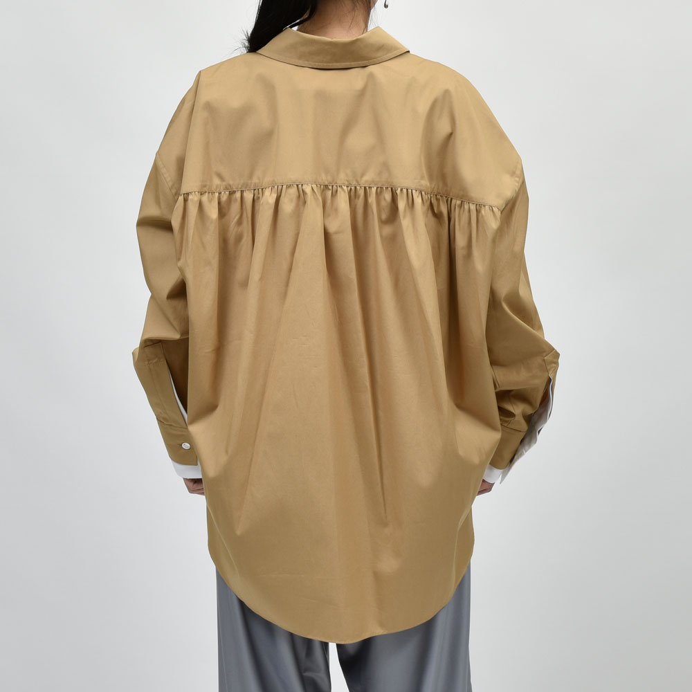 上質なオーガニックポプリン生地を採用したコクーンシルエットのシャツ、背面は特徴的なギャザーを入れており、後ろ姿にも抜かりがありません。