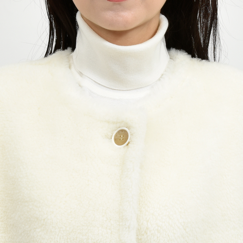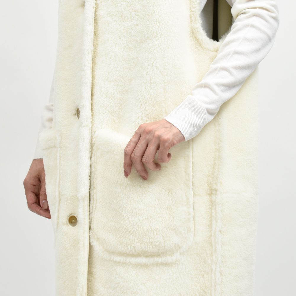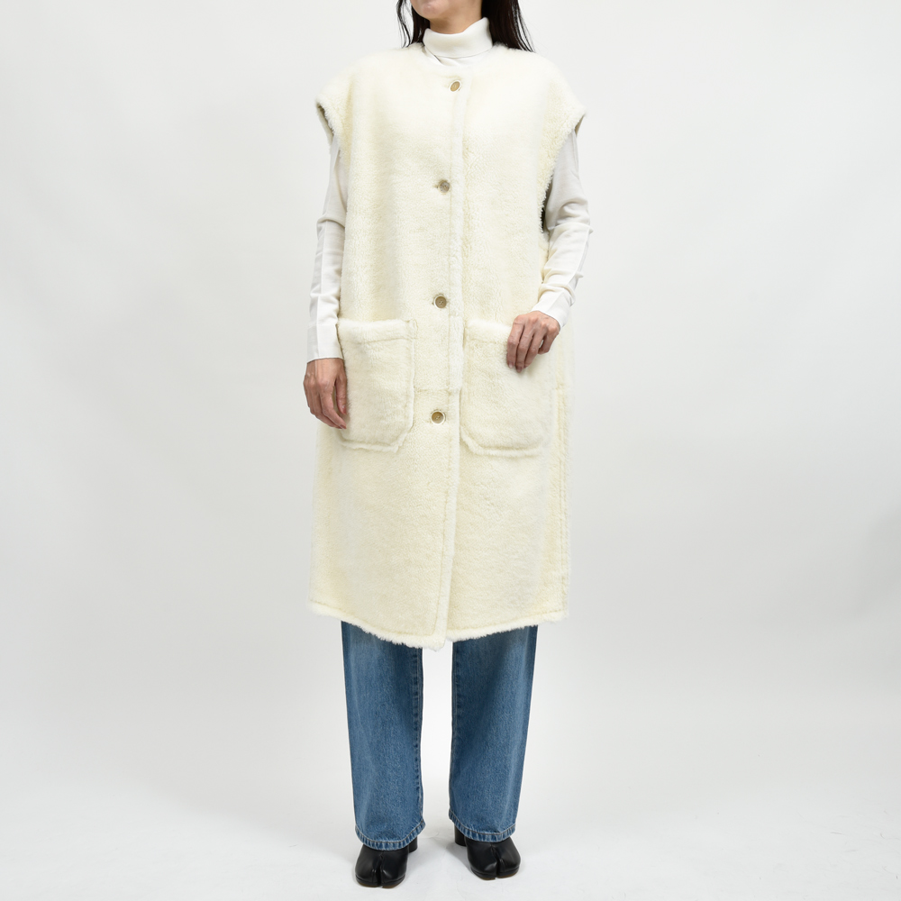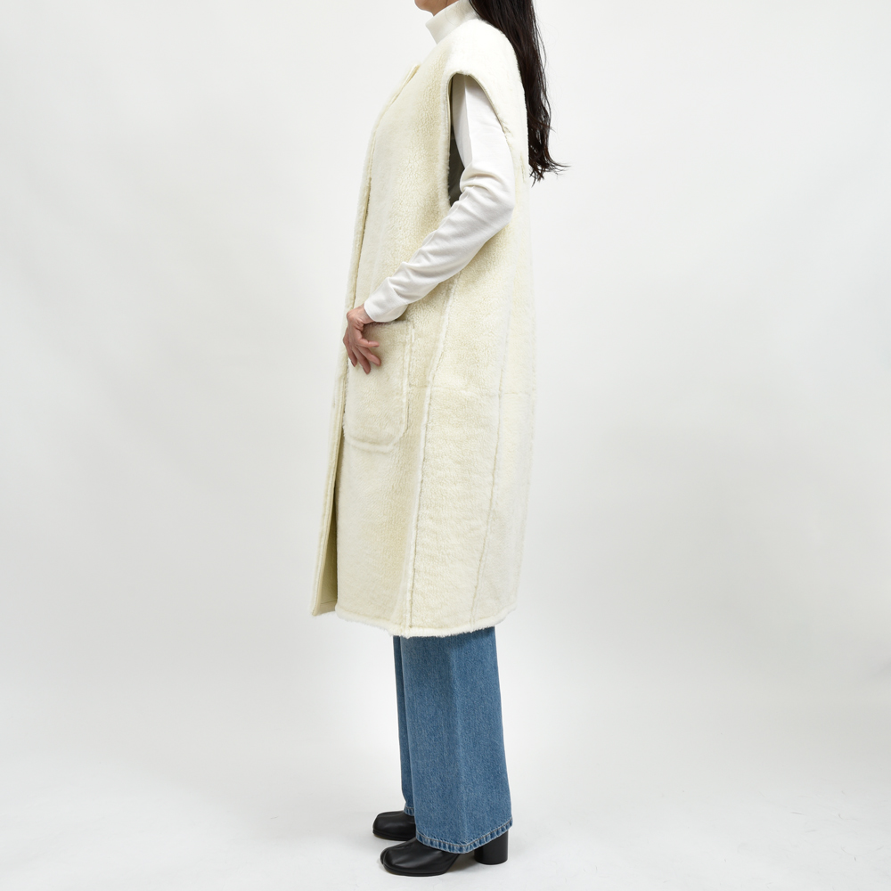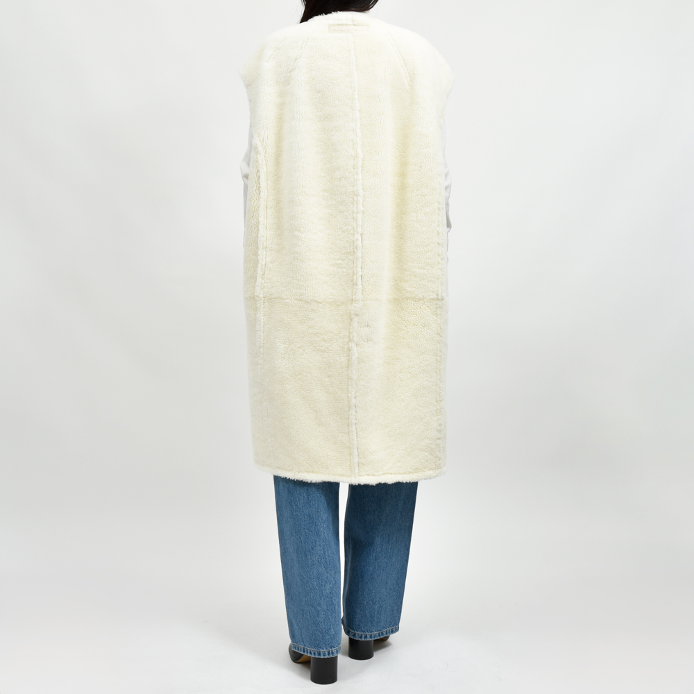 贅沢なムートン素材にあえてノースリーブというアプローチで仕立てたエレガントな一着。