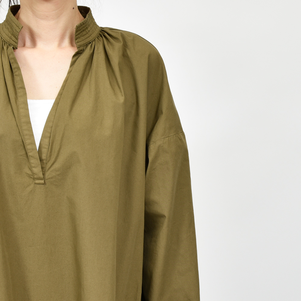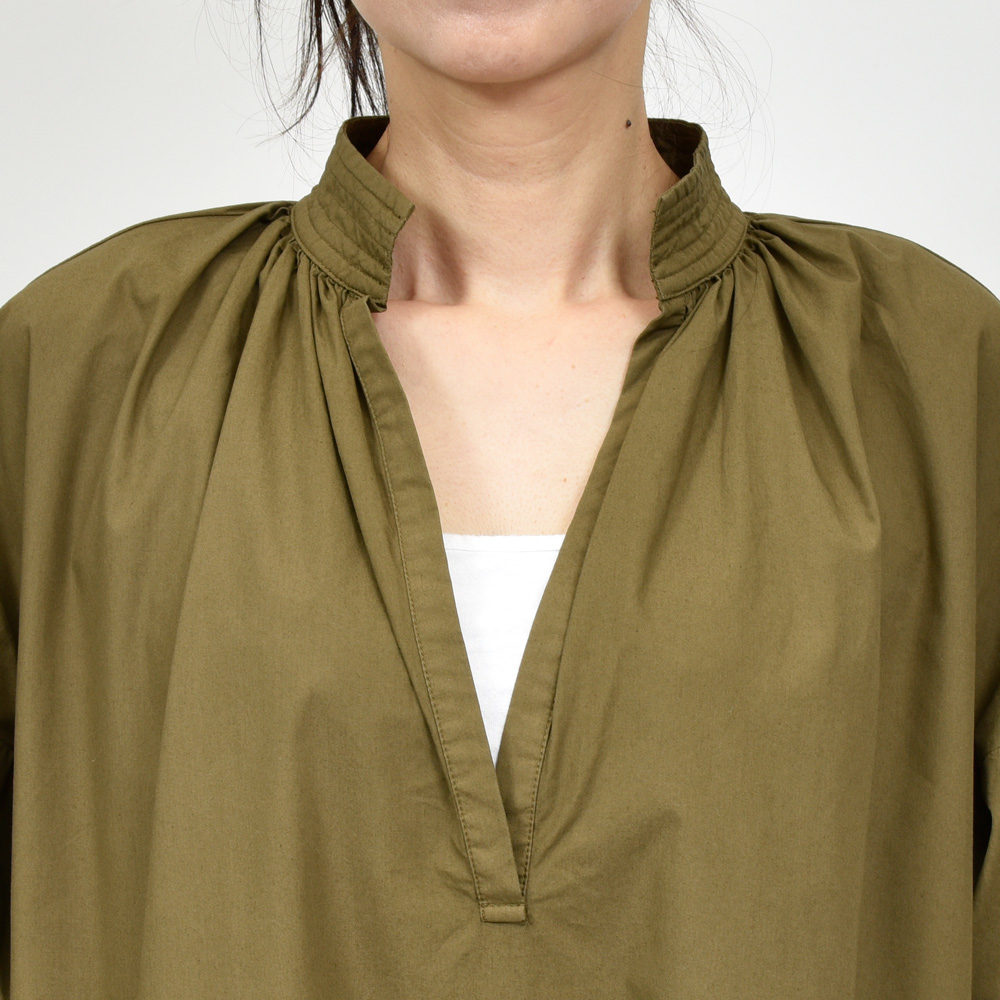 柔らかなギャザーネックラインがアクセントになっており、自然と奥行きのある印象に。