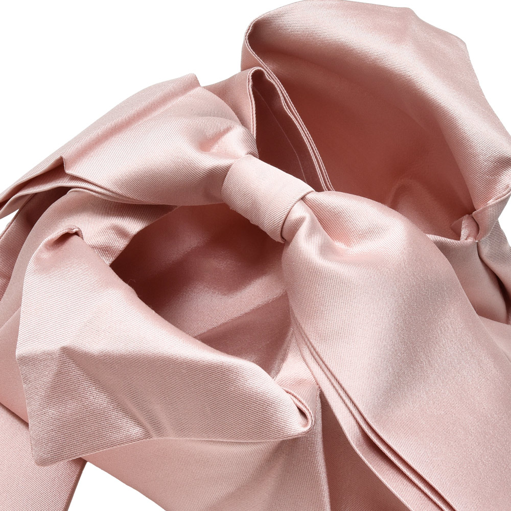 大胆なリボン使いが特徴的で、ハンドルに折り重ねたリボンが飾られています。