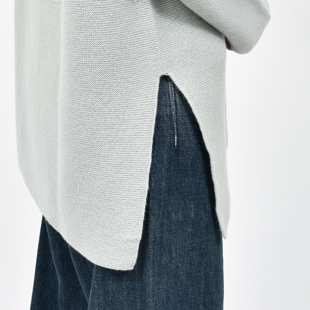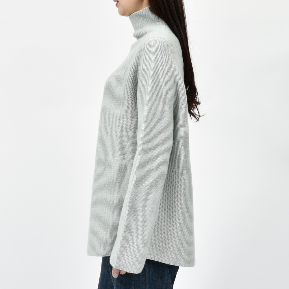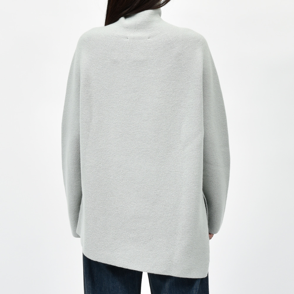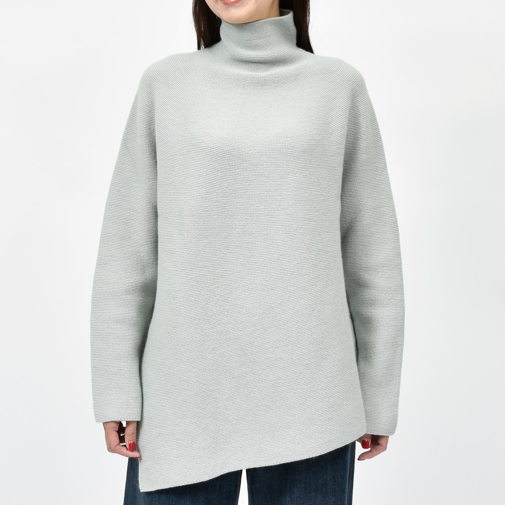 アシンメトリーなデザインが目を惹くハイネックニット。