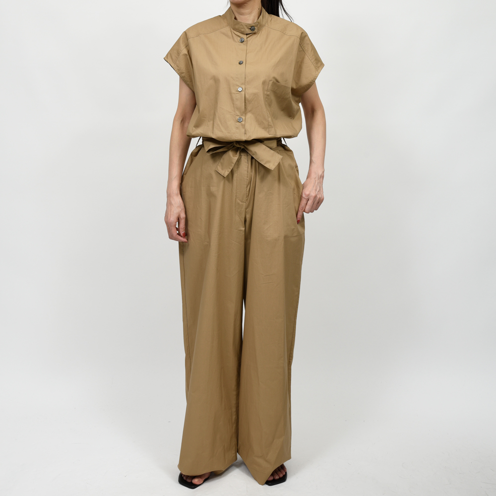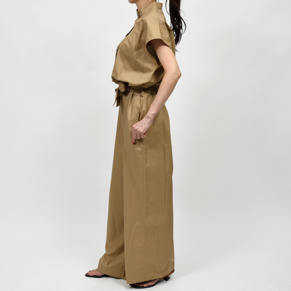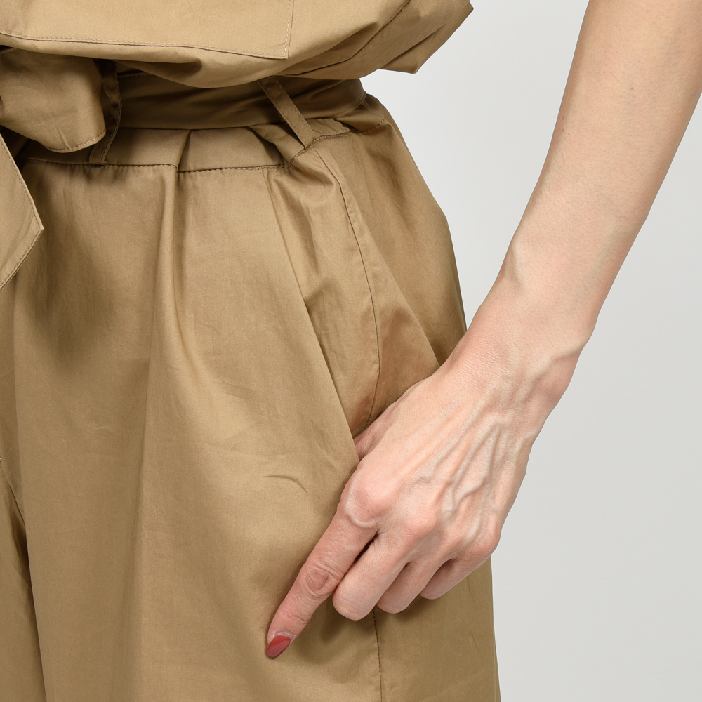 ウエストは共布のベルトを配し、シルエットの調整が可能。