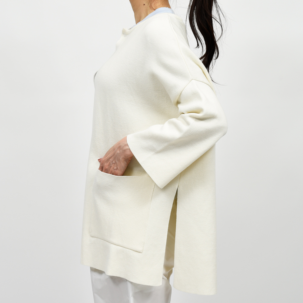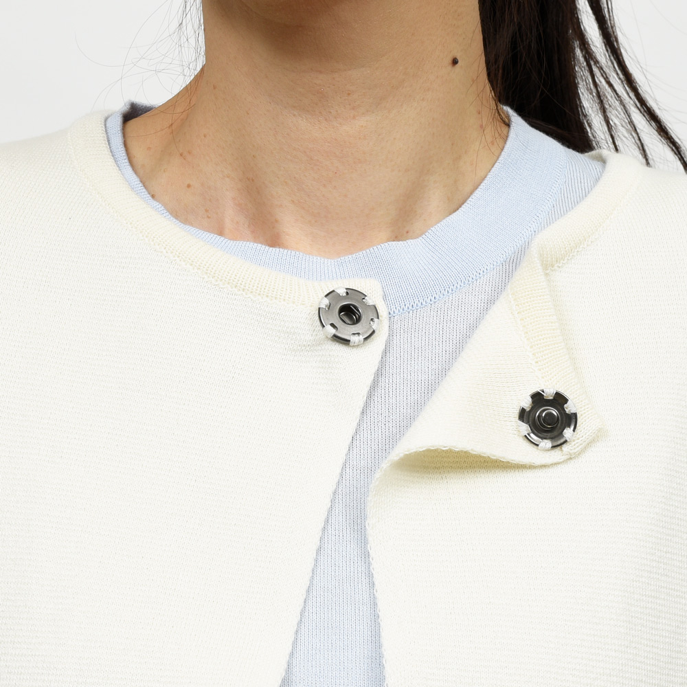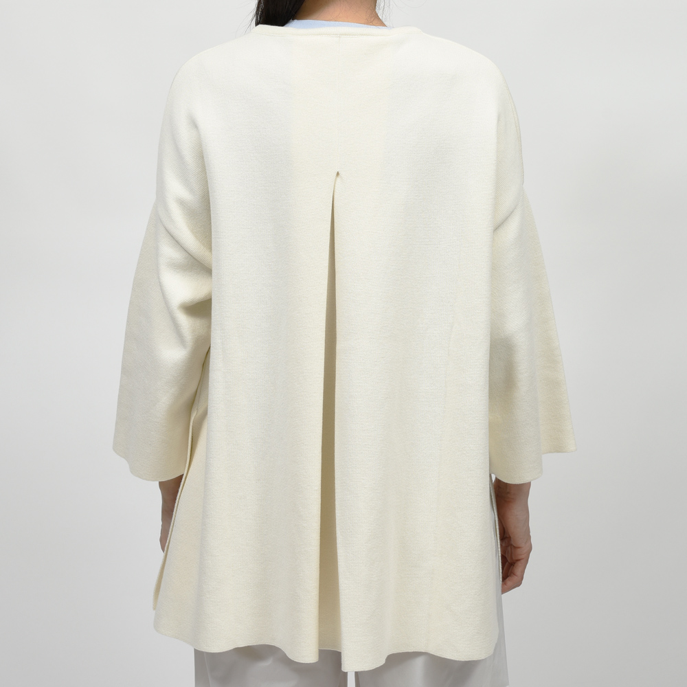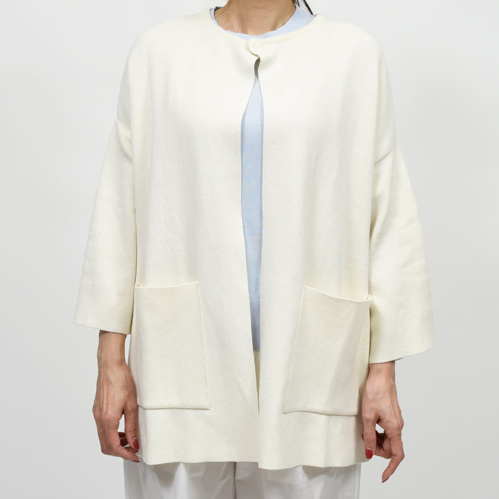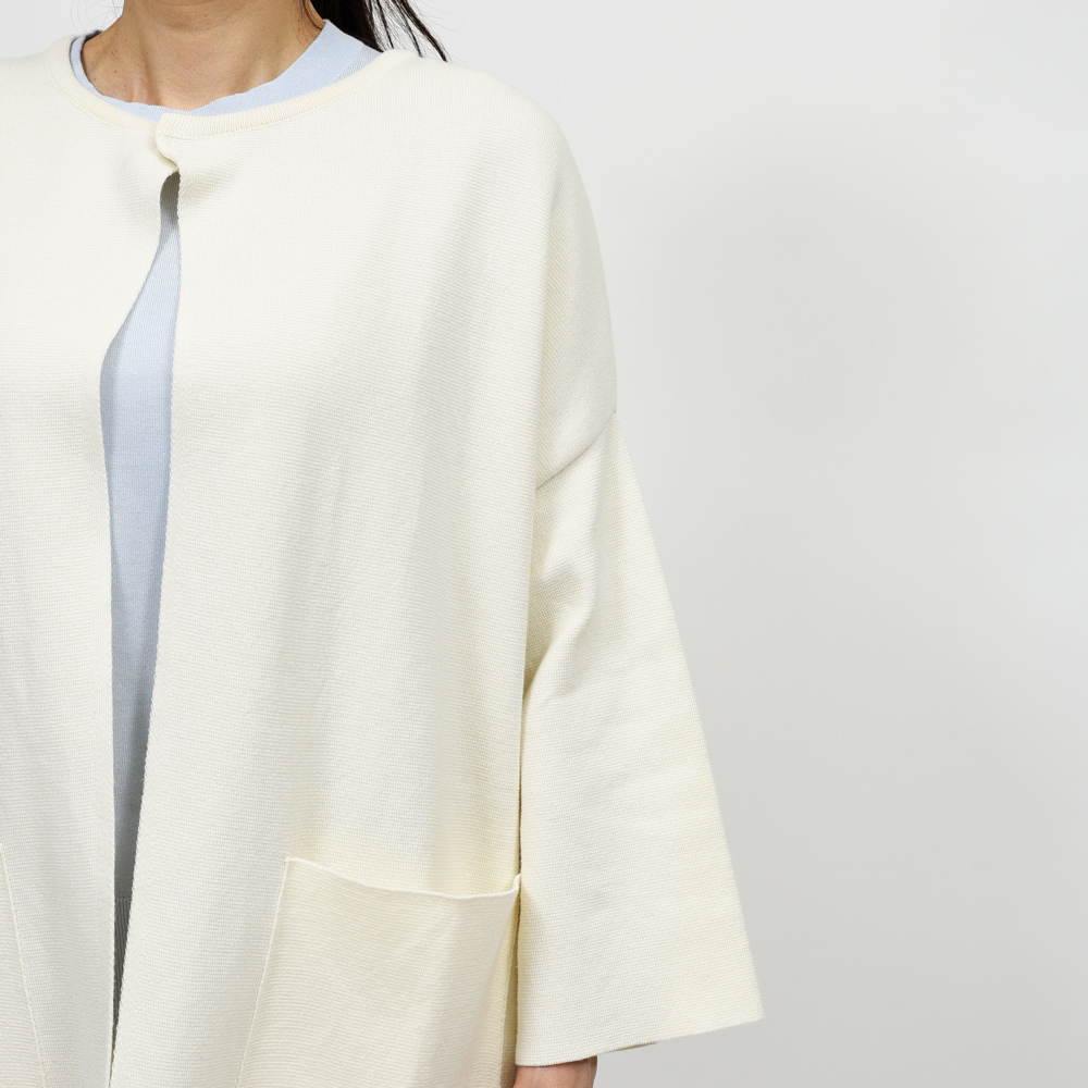 軽やかに羽織れて、上品にきまるノーカラーニットコート。