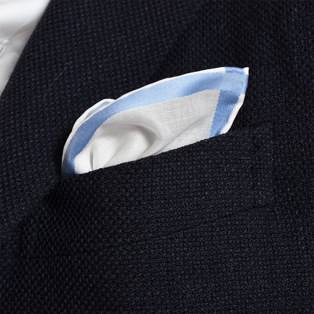 まず、チーフの大きさが良いですね。コットン素材で大きくなると胸ポケットにボリュームが出過ぎてしまうので、これくらいの大きさが◎