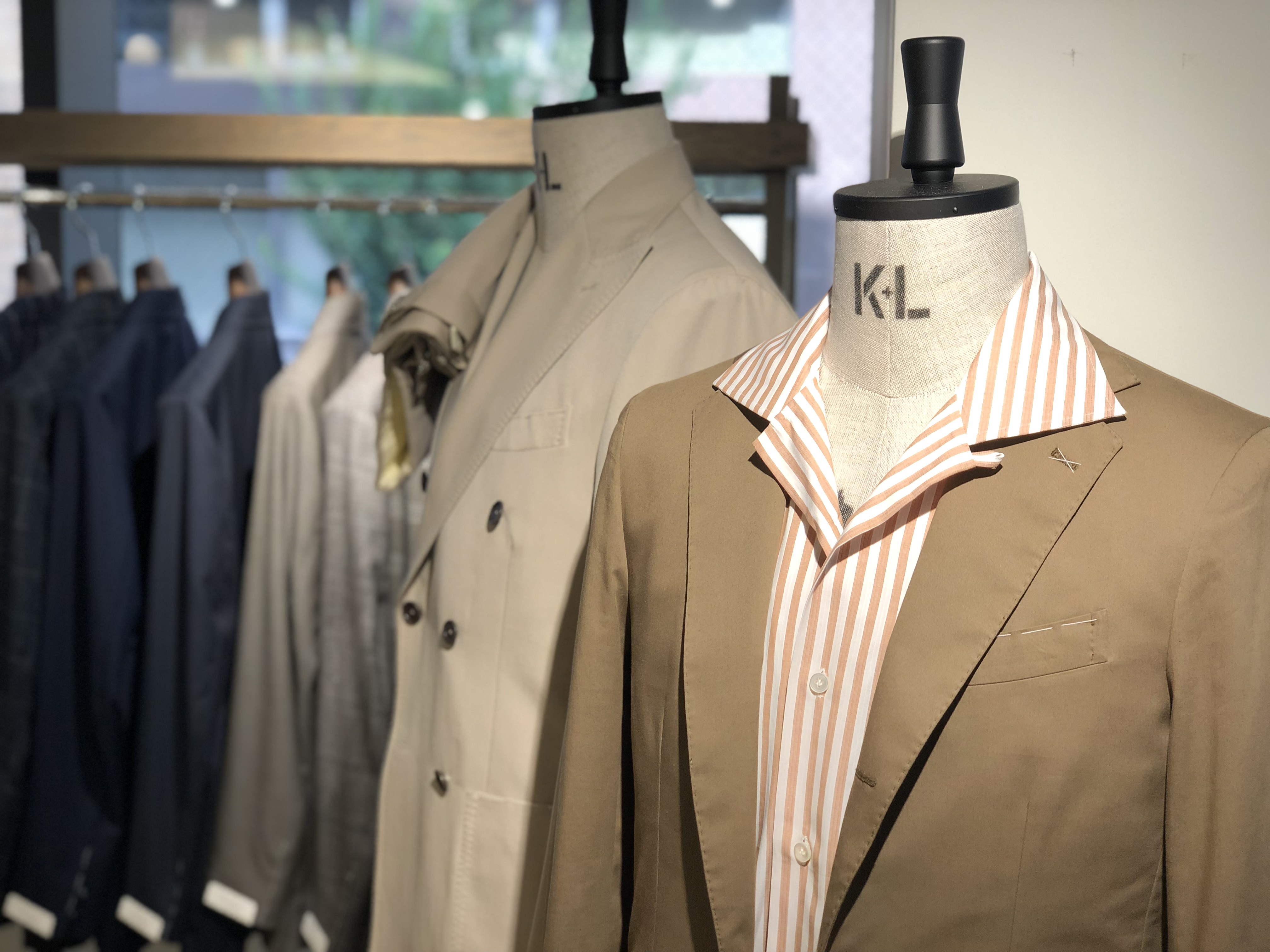 ・ジャケットのモデルは、ハーフキャンバス仕立て3つボタンの"NAPOLI"です。スタンダードな9センチの襟幅でほんのりエレガントな仕上がりに。ドロップは8。軽量感ある着こなしがしやすいよう腰ポケットはフラップ無しです。