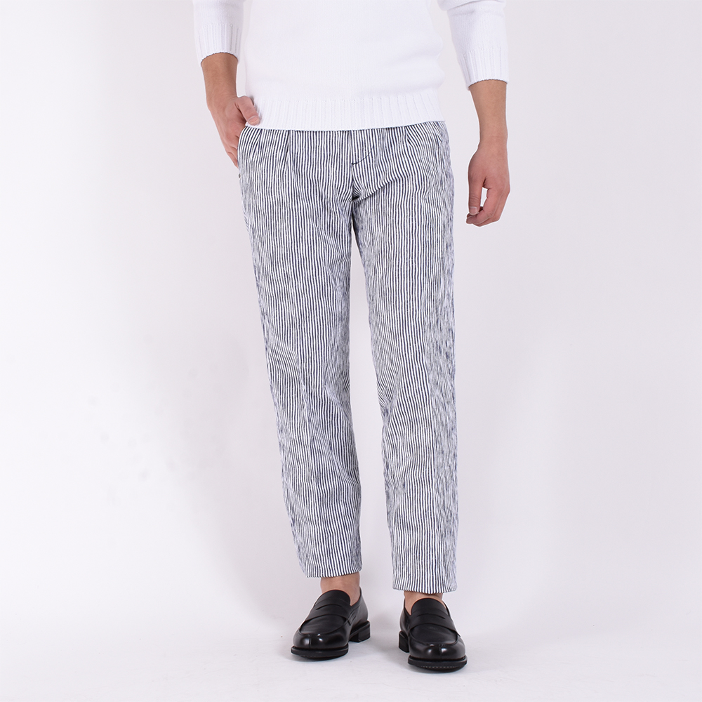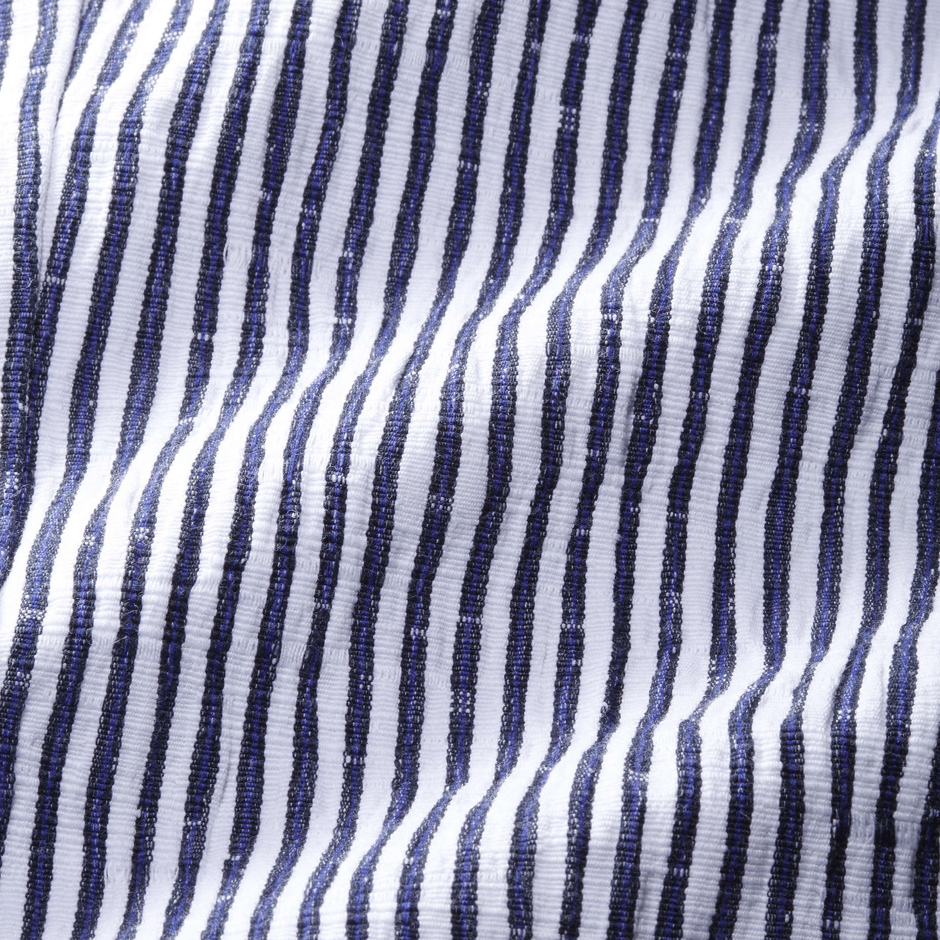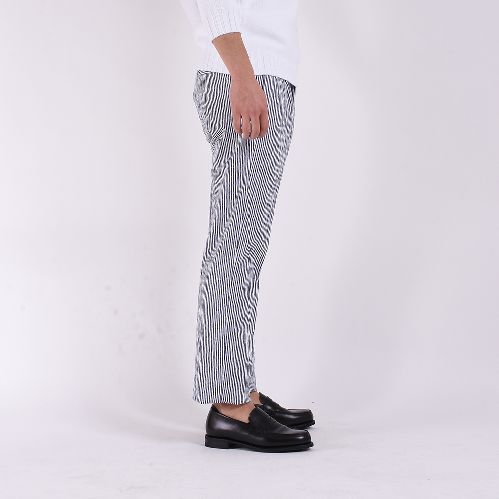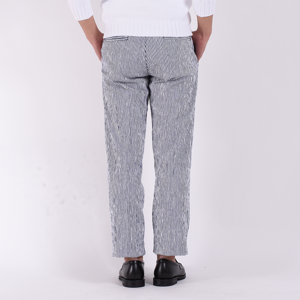 ・シアサッカー特有の凹凸感とストライプのかすれたような入り方が特徴です。さらにびっくりするほどのストレッチ性があるので、サラリとした肌触りとともに快適な穿き心地。