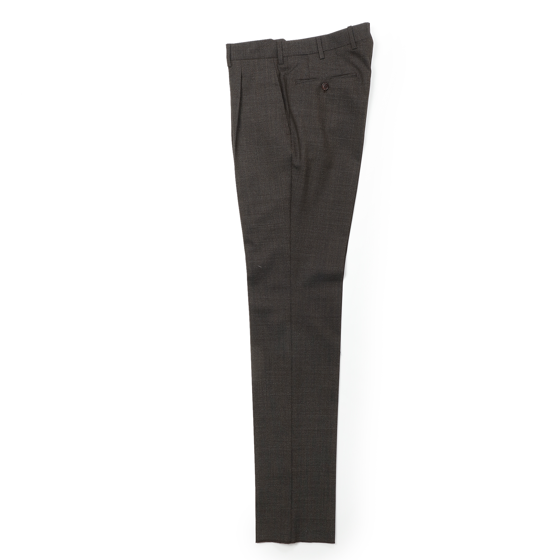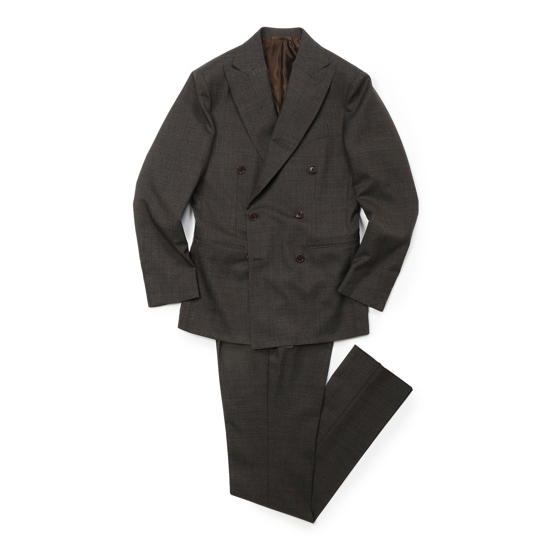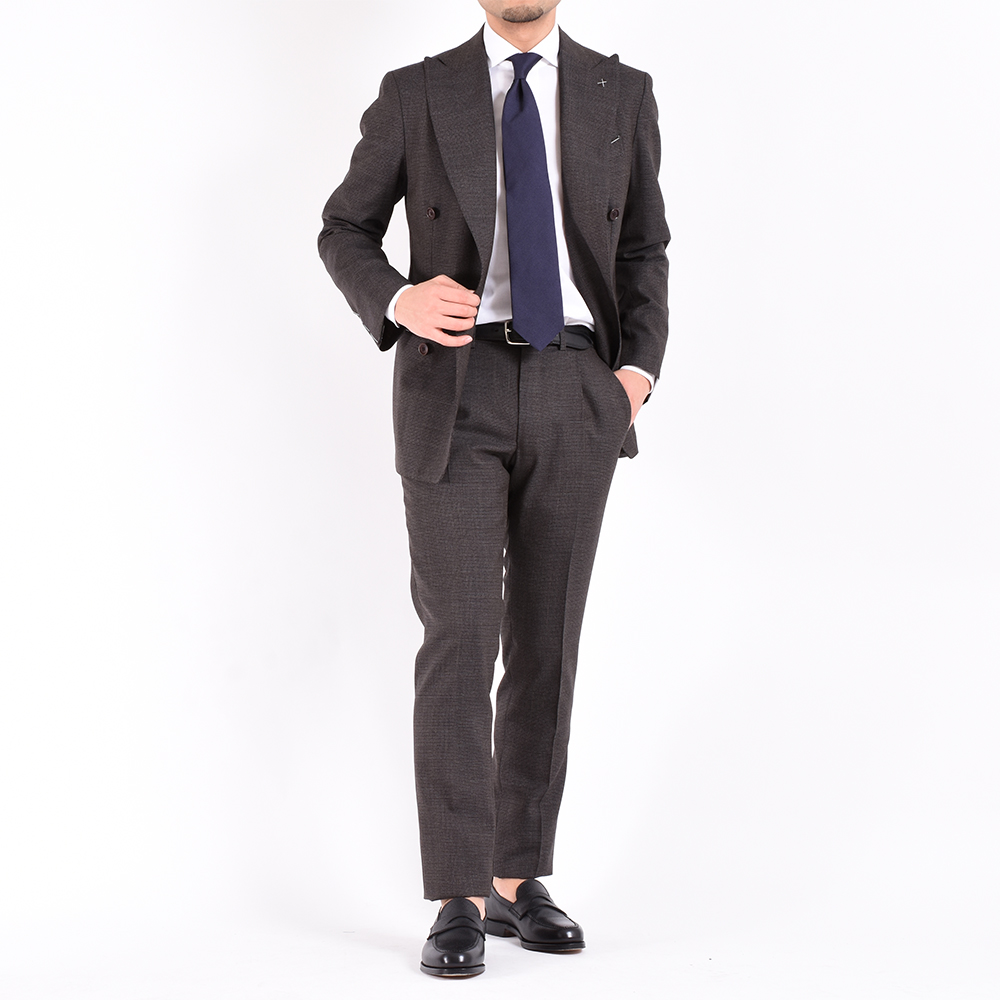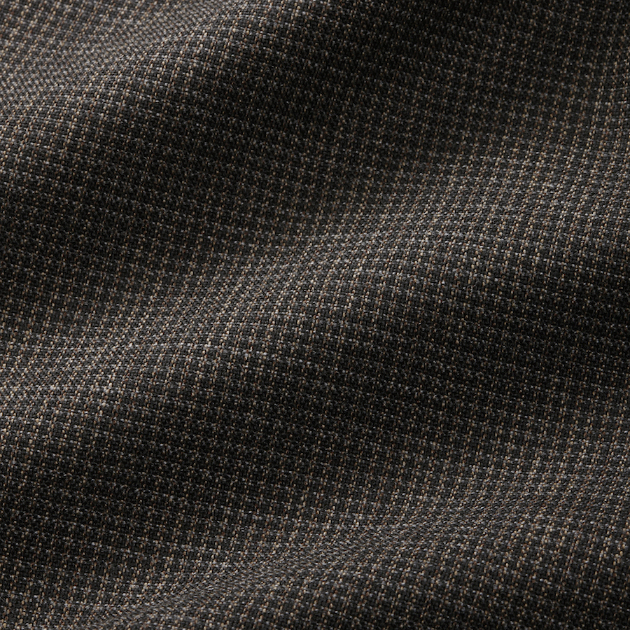 ・ブラウンとブラックを配色したドッグトゥース生地。スーツに求められる落ち着きはあるものの、地味には見えないという稀有な一着。