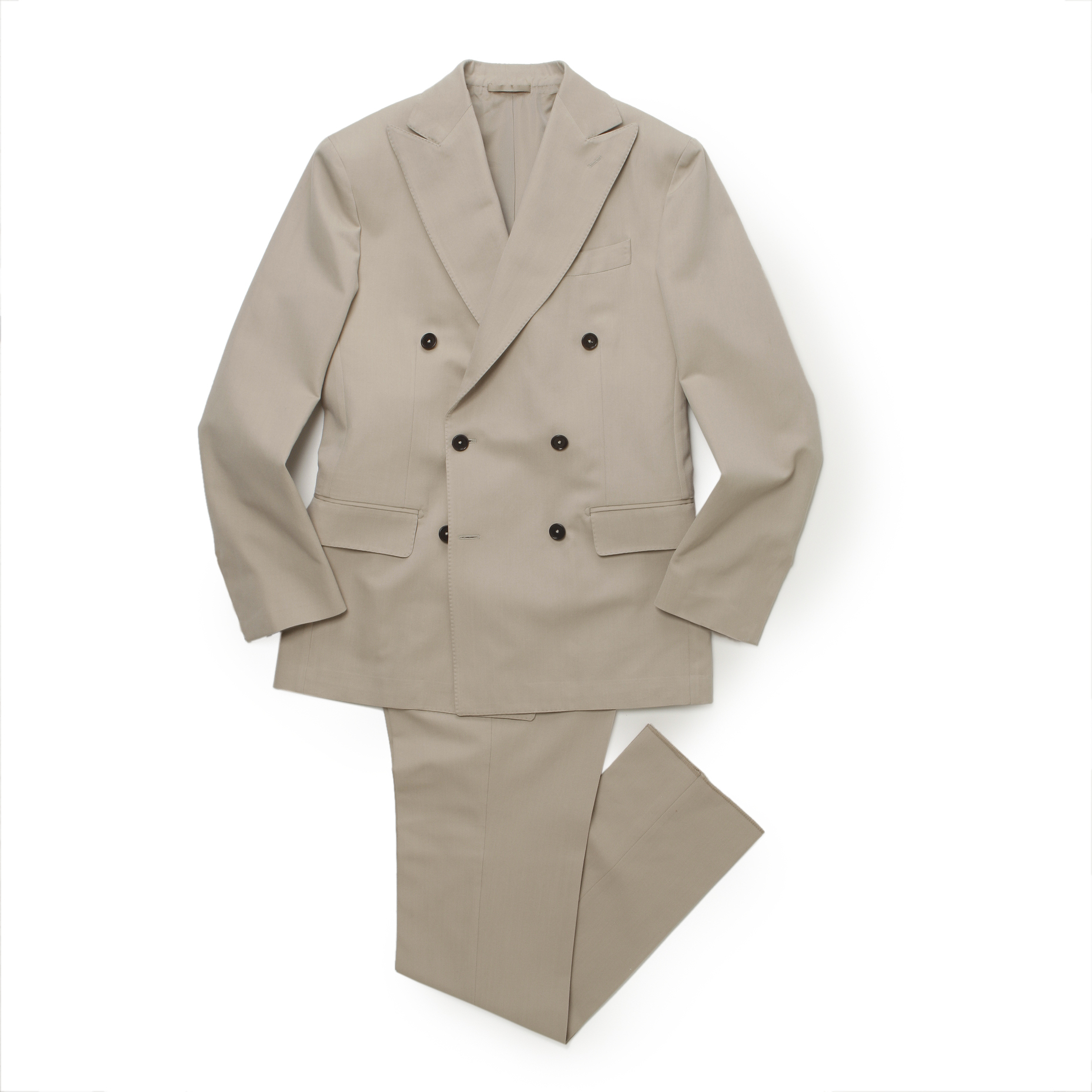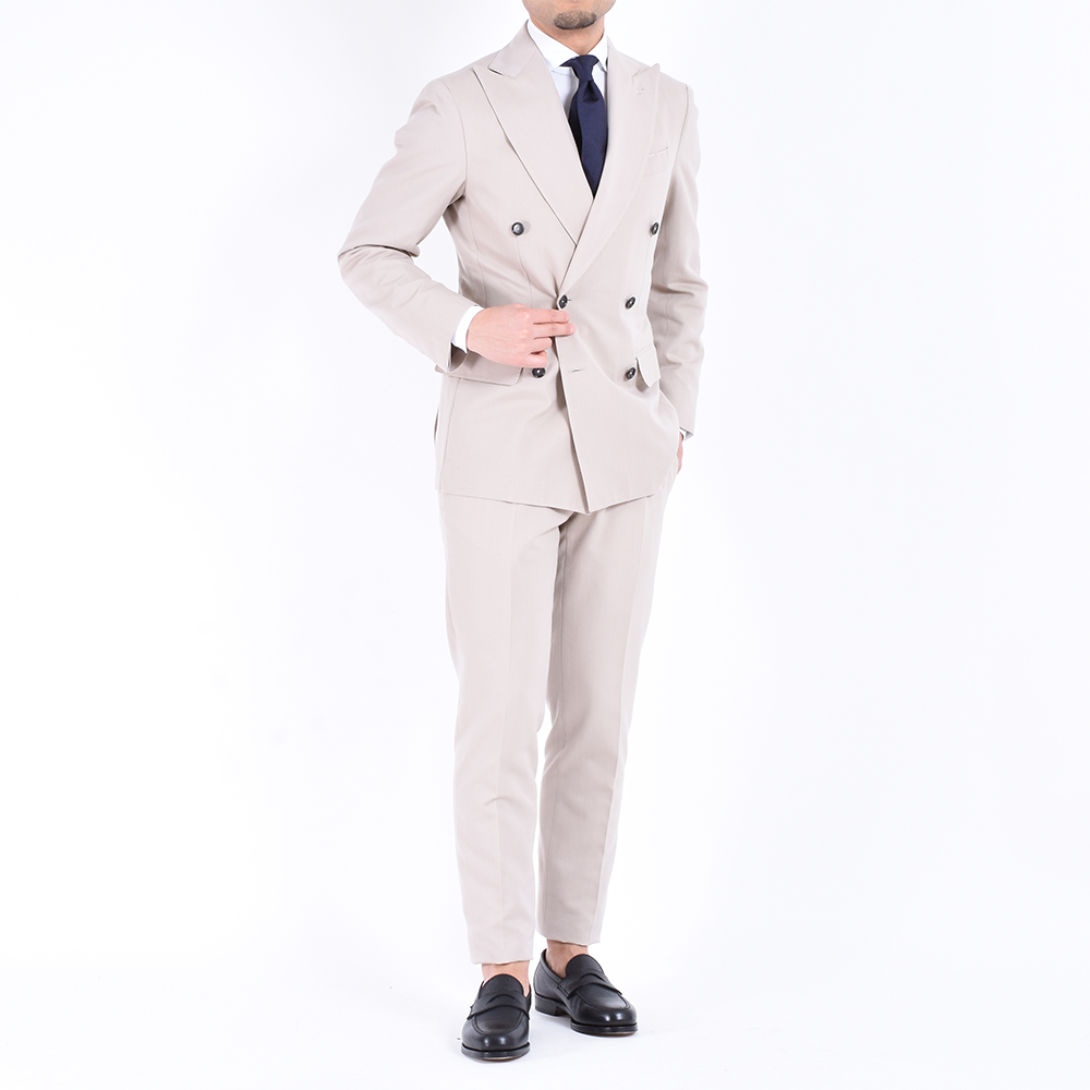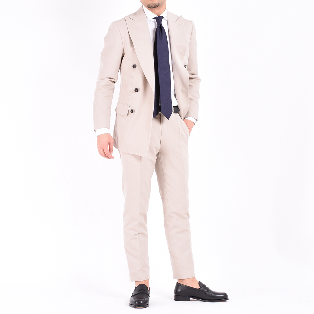 ・ジャケットのモデルはハーフキャンバス仕立て6つボタン両玉縁ポケットの"SORRENTO"です。ややワイドでほのかに丸みあるグラマラスなラペルが特徴。生地を多く使うという意味でダブルブレステッドはラグジュアリーな雰囲気を醸します。