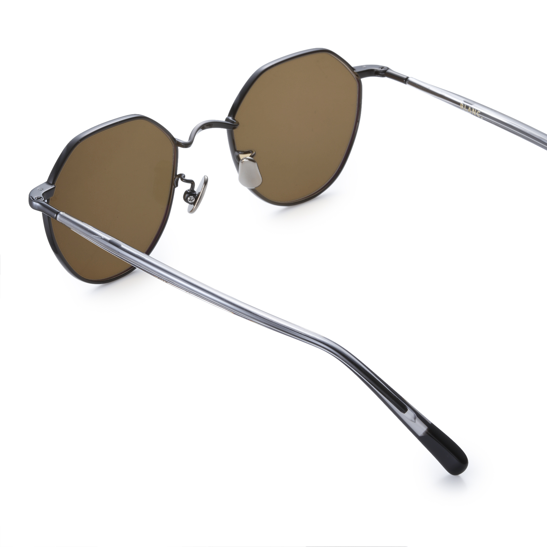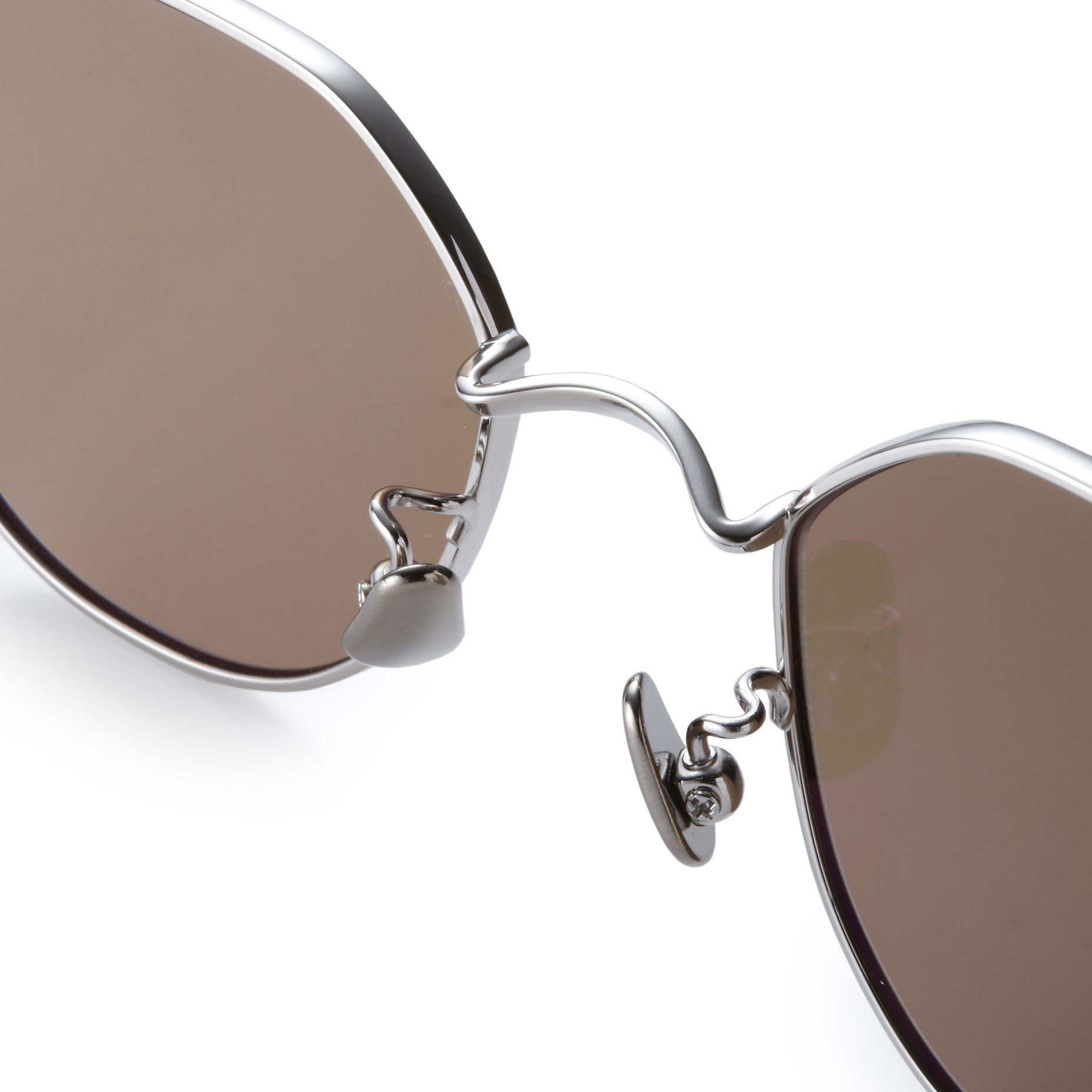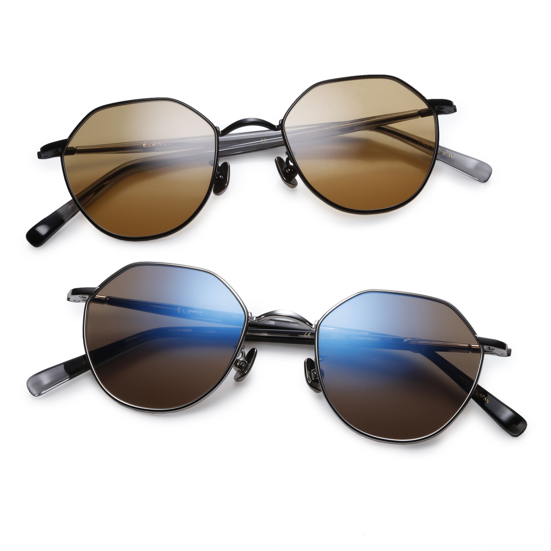 ・シルバーフレームはブラック系マーブル、マットブラックフレームはライトグレーとセル調テンプルをフレーム色によって使い分ける細やかさが完成度を高めています。一方レンズカラーはシルバーがブラウン×ブルーのハーフミラー、マットブラックはライトブラウンです。