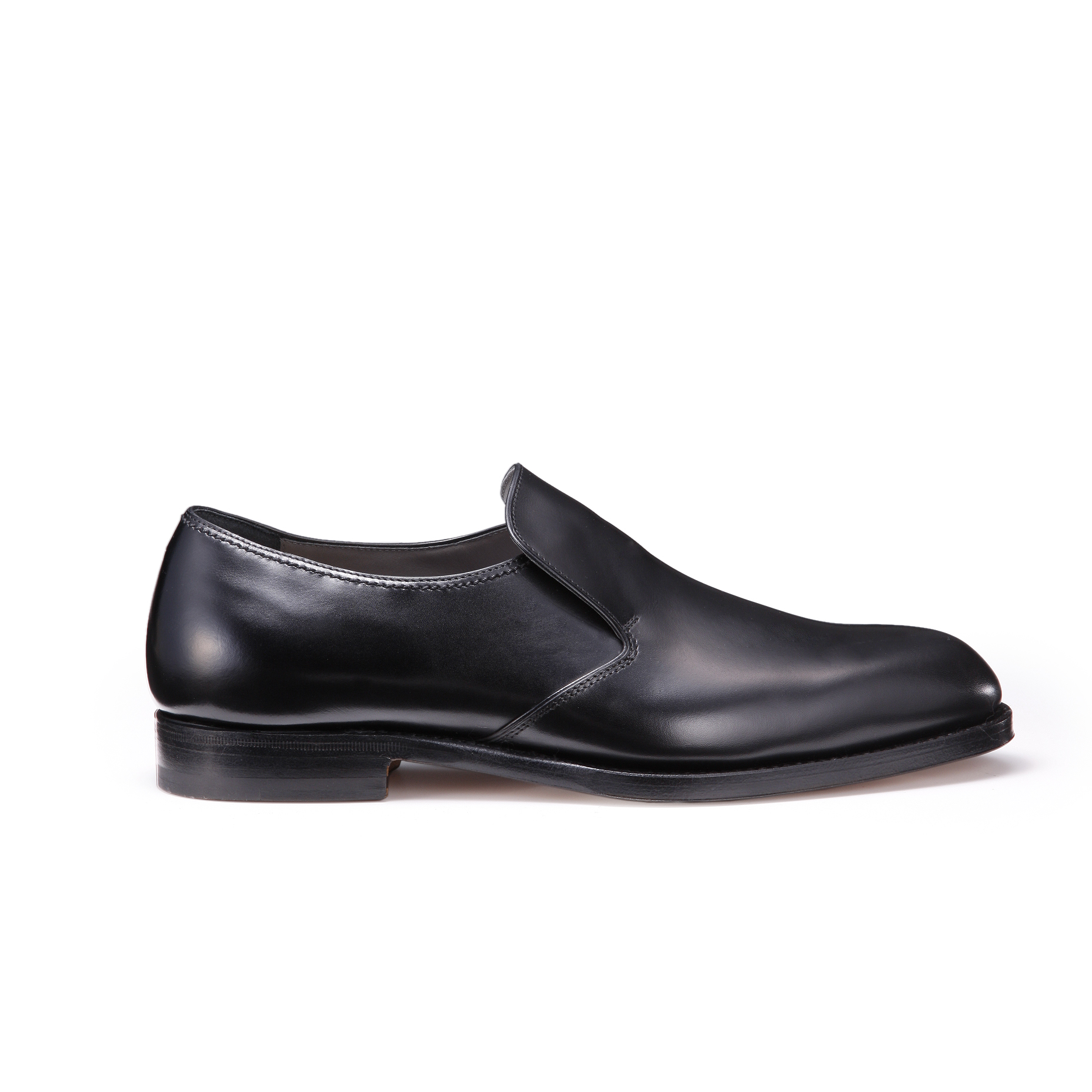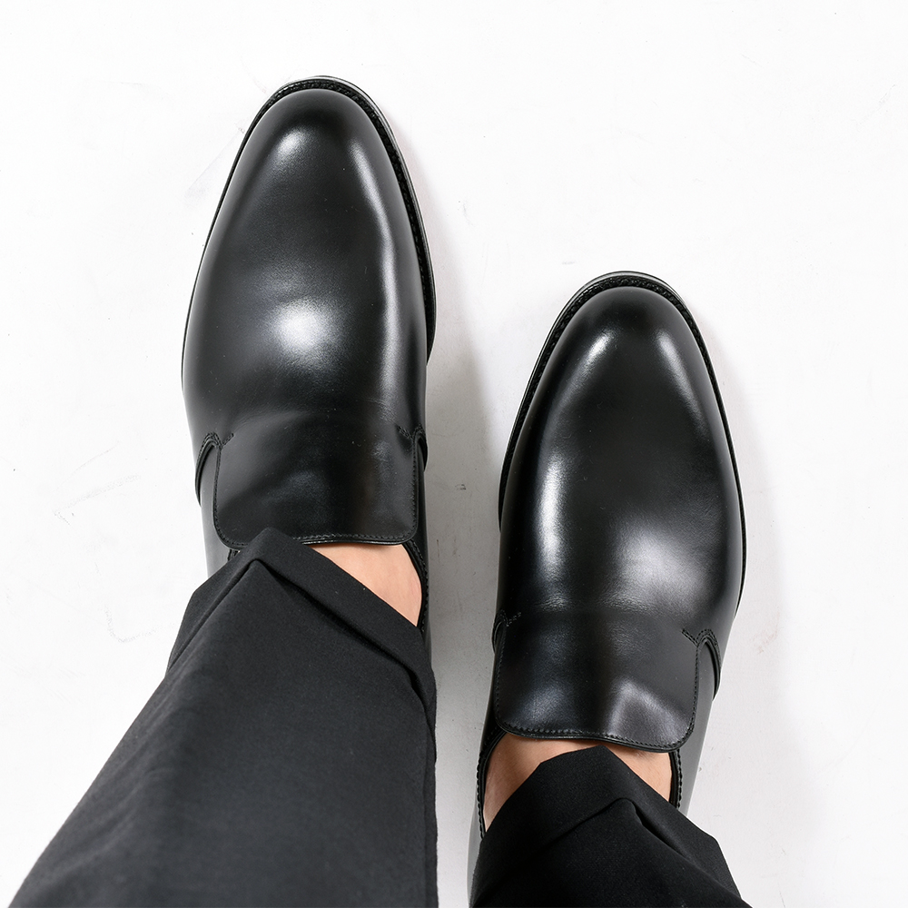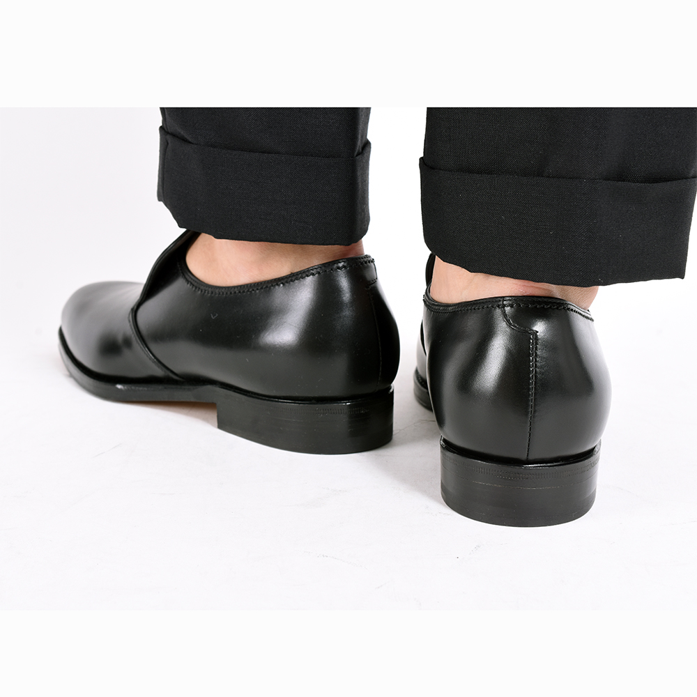 ・アッパー唯一のデザインポイントは、甲のタンからサイドに流れる切り返し。非常にシャープな印象をもたらしますが、適度に張ったコバとのマッチングにより華奢過ぎる印象にはなりません。甲のタン下にはゴムが通されていることで、スムーズな足入れを実現。
