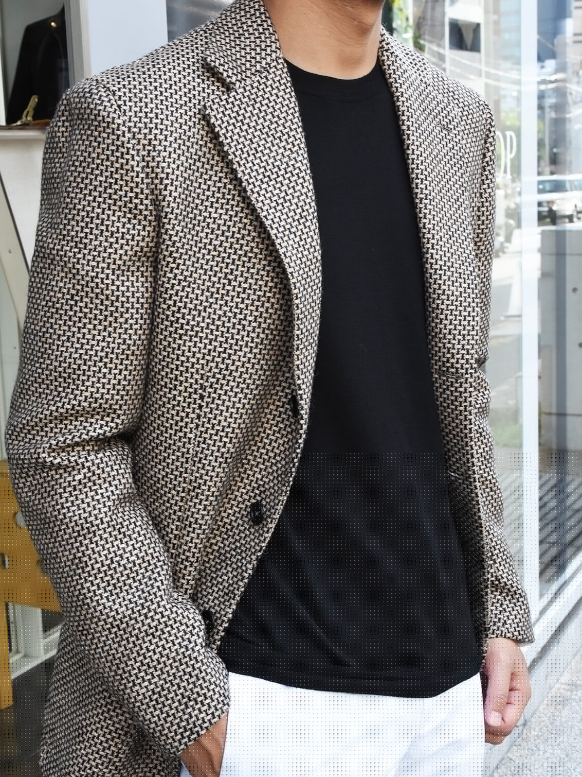 経糸と緯糸を違った色で織った、独特な柄が特徴的なこちらのジャケット。一見、近くで見ると派手ですが、約2m先から見るとかなり落ち着いた印象に見えます。ベージュとブラックの糸を使用しているため、茶系や黒系のアイテムとも相性は抜群。しっかりとした重量感のある生地感が特徴です。サイズは普段選ばれているサイズでよろしいかなと思います。