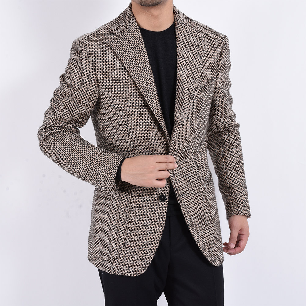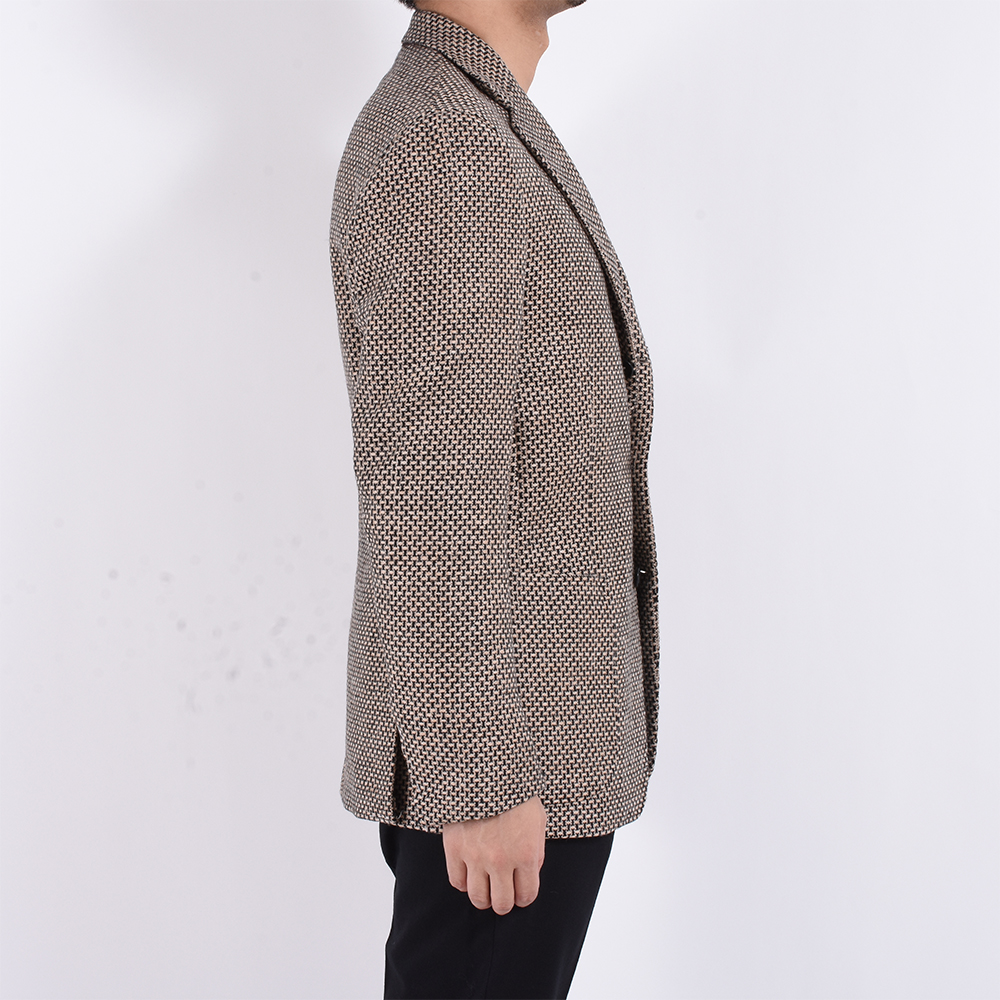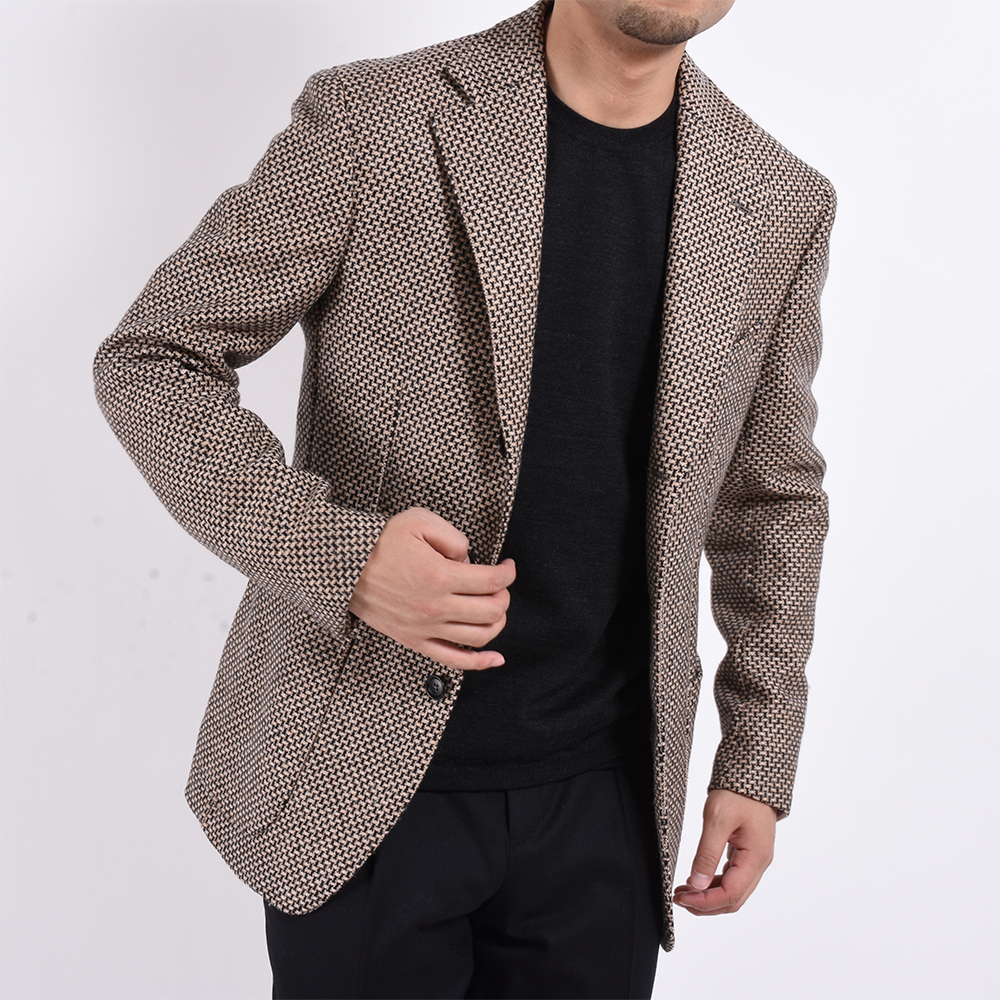 ・一見すると派手に見える生地ではあるものの、インナーやボトムズの合わせ方でシックにもラグジュアリーにも見せられるのがベージュ&ブラックの特徴。さまざまな着こなしを楽しめます。目付は510グラム。