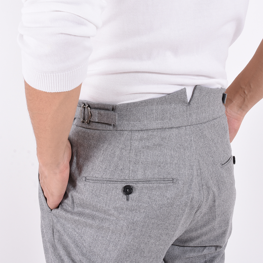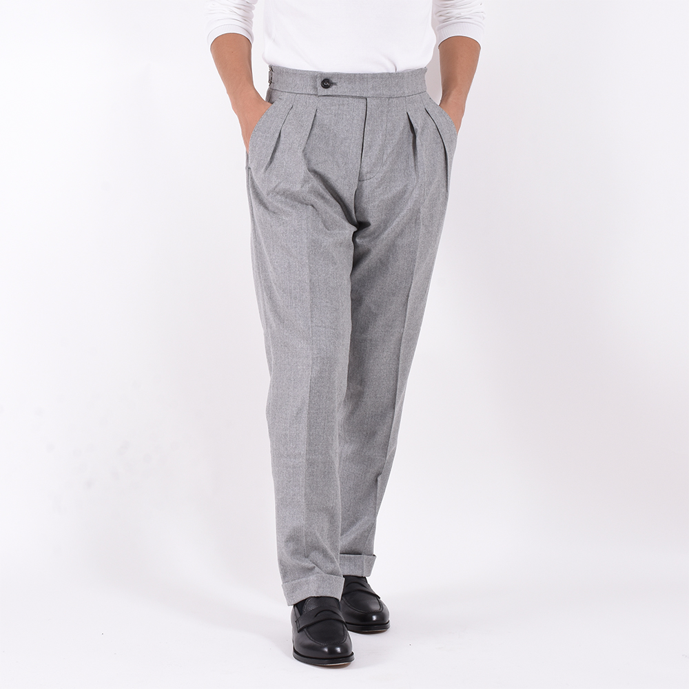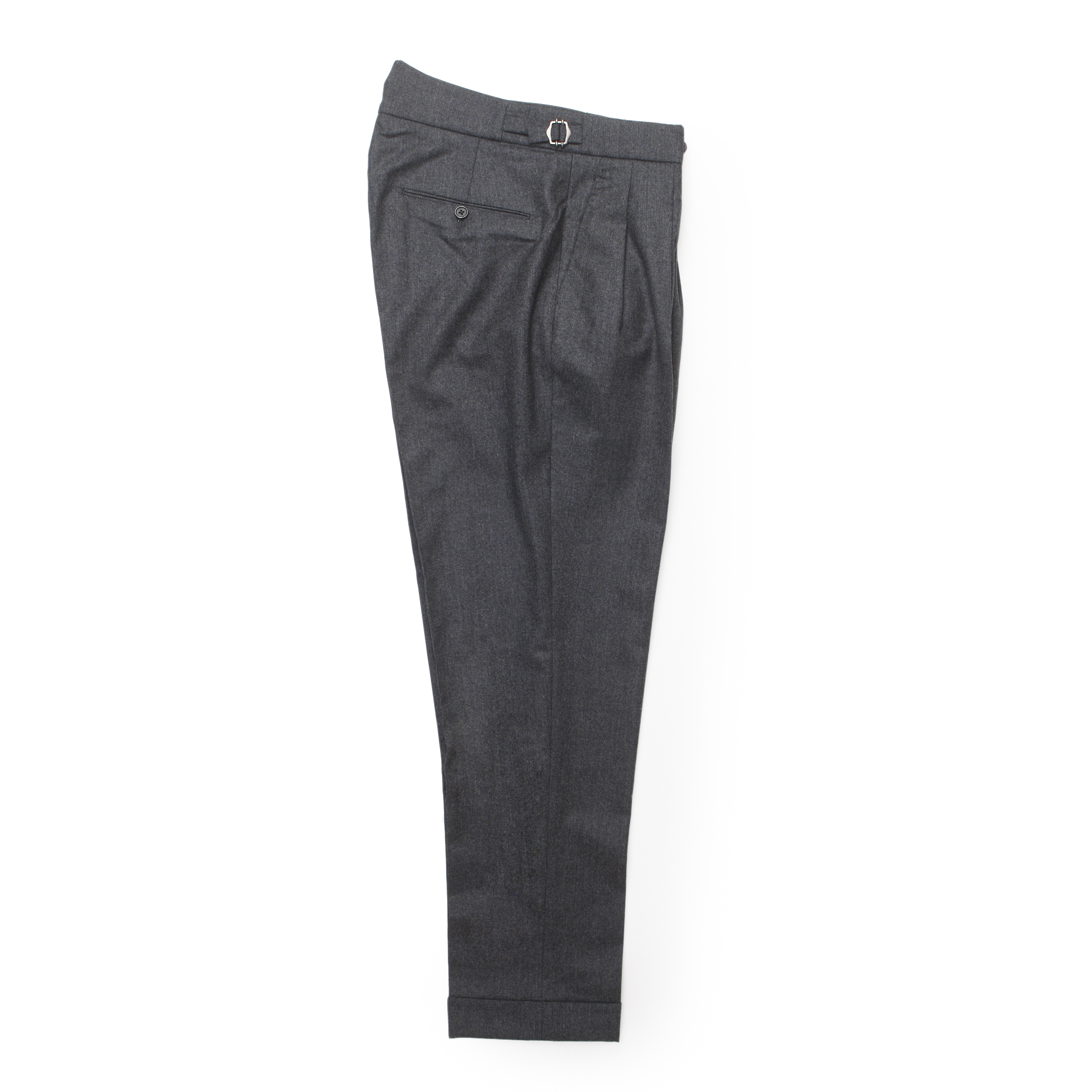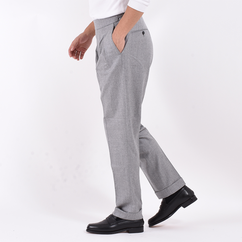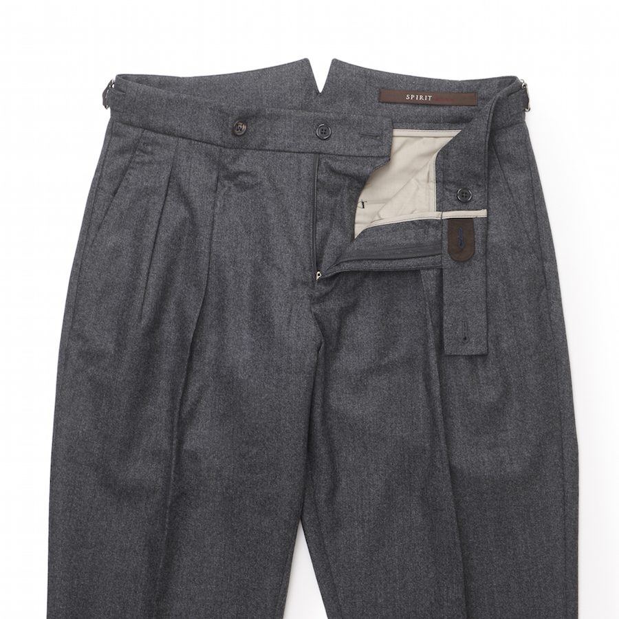 ・グルカパンツがモチーフとなっている"scotch(スコッチ)"。特徴的なディテールはサイドアジャスター、2インプリーツ、そしてハイバック。フロント持ち出しの長さは控えめにすることでクラシカル過ぎない見え方に。