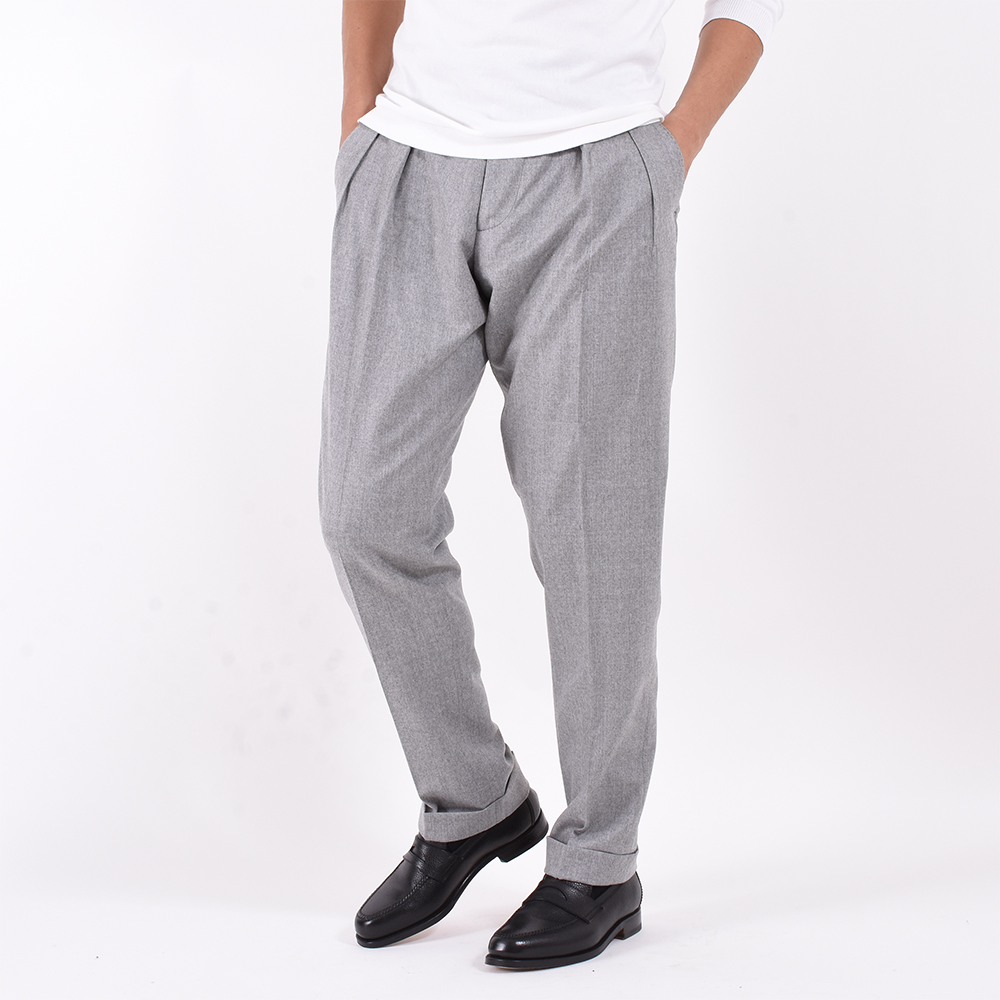 全体的に非常にワイドなシルエットですが、しっかりとテーパードは効いているので脚のラインはとても綺麗に見せてくれます。そして、なんと言っても “楽”。生地感はとても肌触りが良く、柔らかなフランネルとなっております。サイズは普段選ばれているサイズでよろしいかなと思われます。細身体系でサイズ42を着用しピッタリでした。