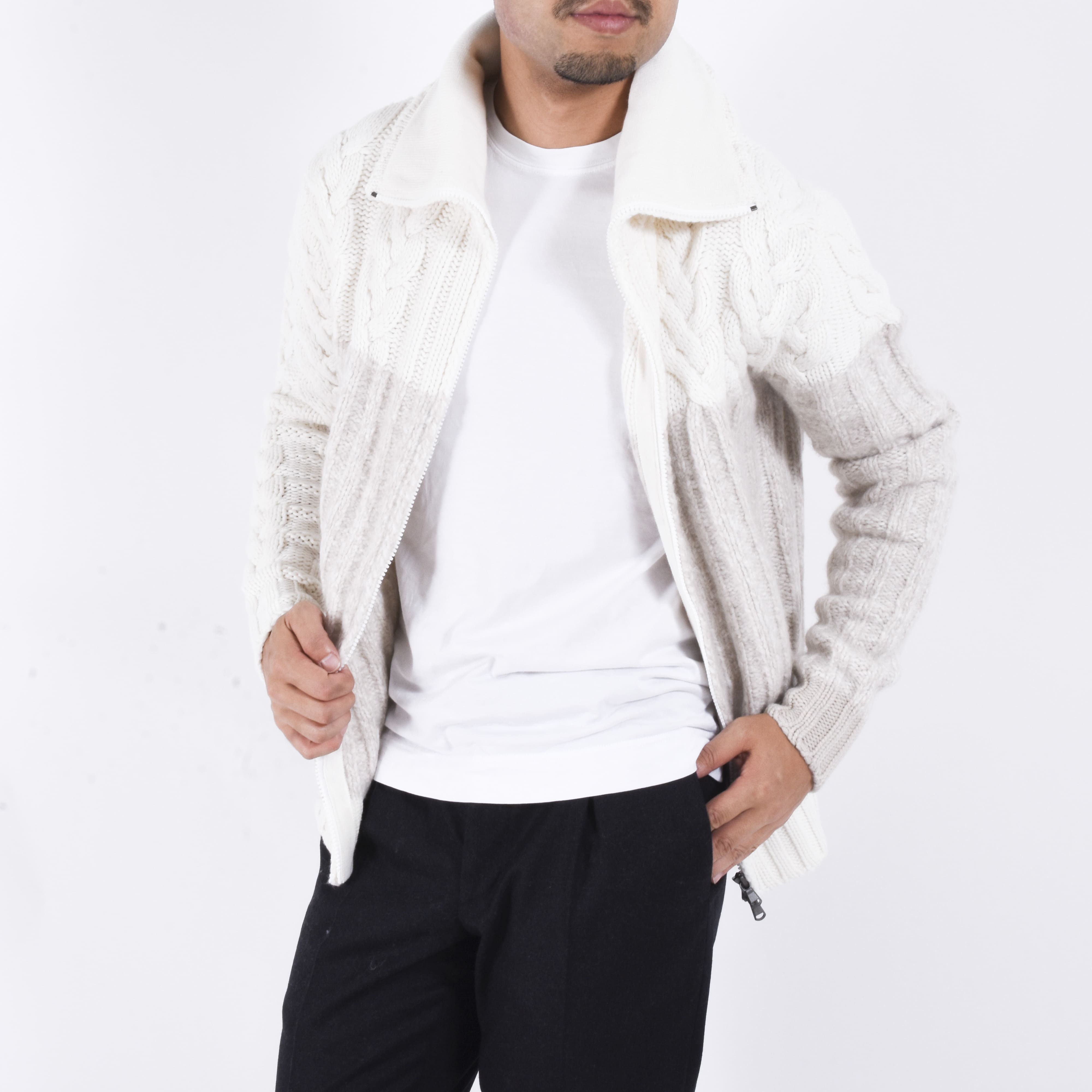 ケーブル編みの柔らかさが印象的でありつつ、ジップアップなのでブルゾン感覚で着用できて、秋冬時の羽織物をお探しの方には是非お勧めしたい一着です。ジップを上まで閉め、首回りをたるませながら羽織るといったこなれた着方もカッコいいでしょう。こちらを羽織る際はTシャツの上から着用し、カシミアの柔らかさを是非楽しんでいただきたいです。