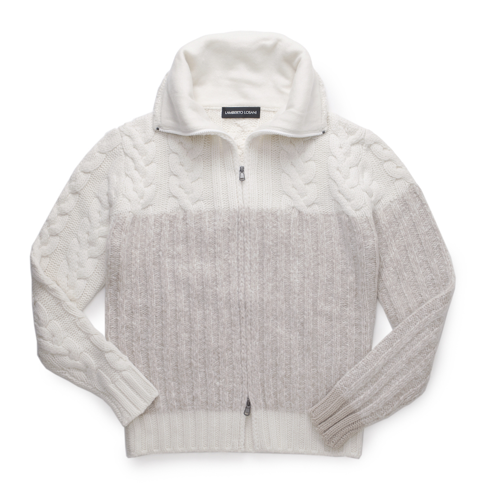 ・オフホワイト部分はカシミア100%、ベージュ部分はシルク&カシミアという贅沢さ。さらに袖はアシンメトリーデザインという「LAMBERTO LOSANI(ランベルト ロザーニ)」の高いデザイン性と技術力がふんだんに発揮された一着です。