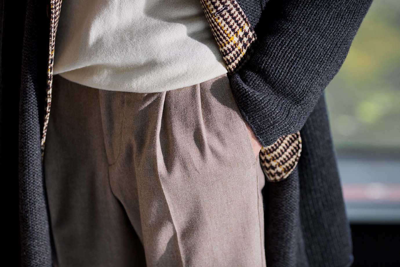 ・モデルは今シーズン初登場となる"RID-SMILE"。2プリーツのフロントはイマドキ感ある見え方で、ワタリから美しくテーパードするラインは穿く人を選ばない万能シルエットです。