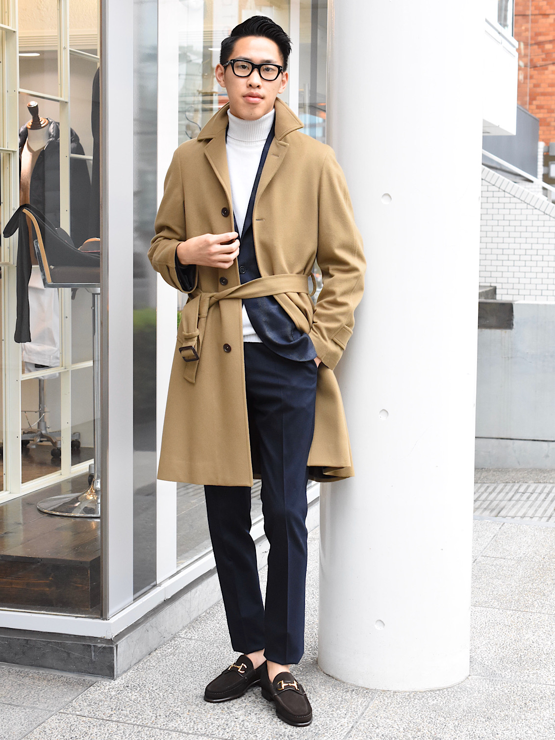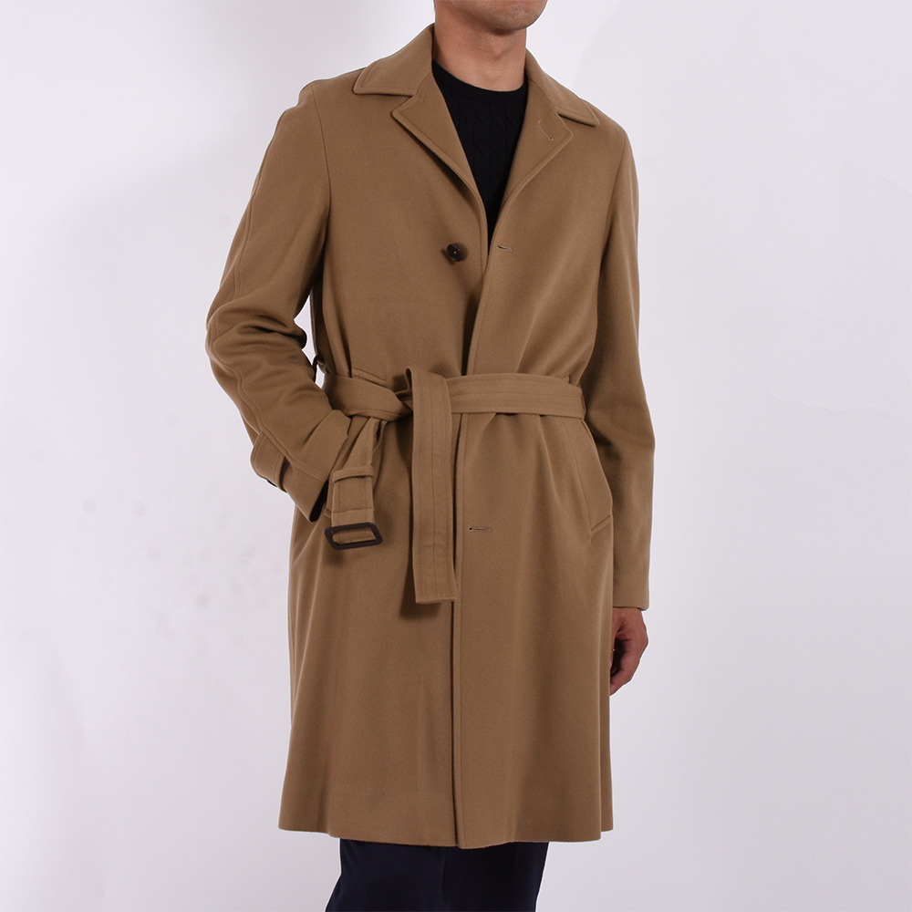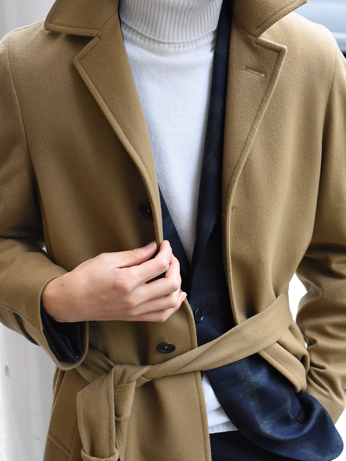 ベルテッドコートは個人的に大好きなアイテムであり、実際試着した時「さすが…」と感じました。ベルトを男らしく結んだシルエット、ベルトを締めずにポケットに入れたこなれた着こなし、上品な風合いのカシミア混はやはり格別。スーツスタイルからカジュアルスタイルまで使えるこちらのコートを是非男らしく、そして上品に着こなしてみてはいかがでしょうか。襟を立てたスタイルはしっかり首元が隠れ、着丈は膝上5cm程の長さでした。細身体型でジャケットの上からサイズ46を着用しぴったりでしたので、普段選ばれているサイズでよろしいかなと。