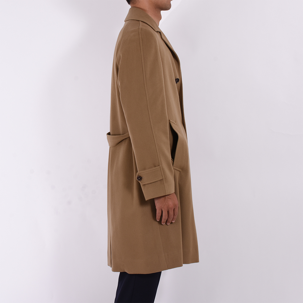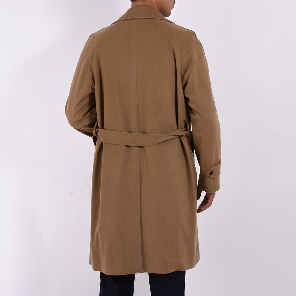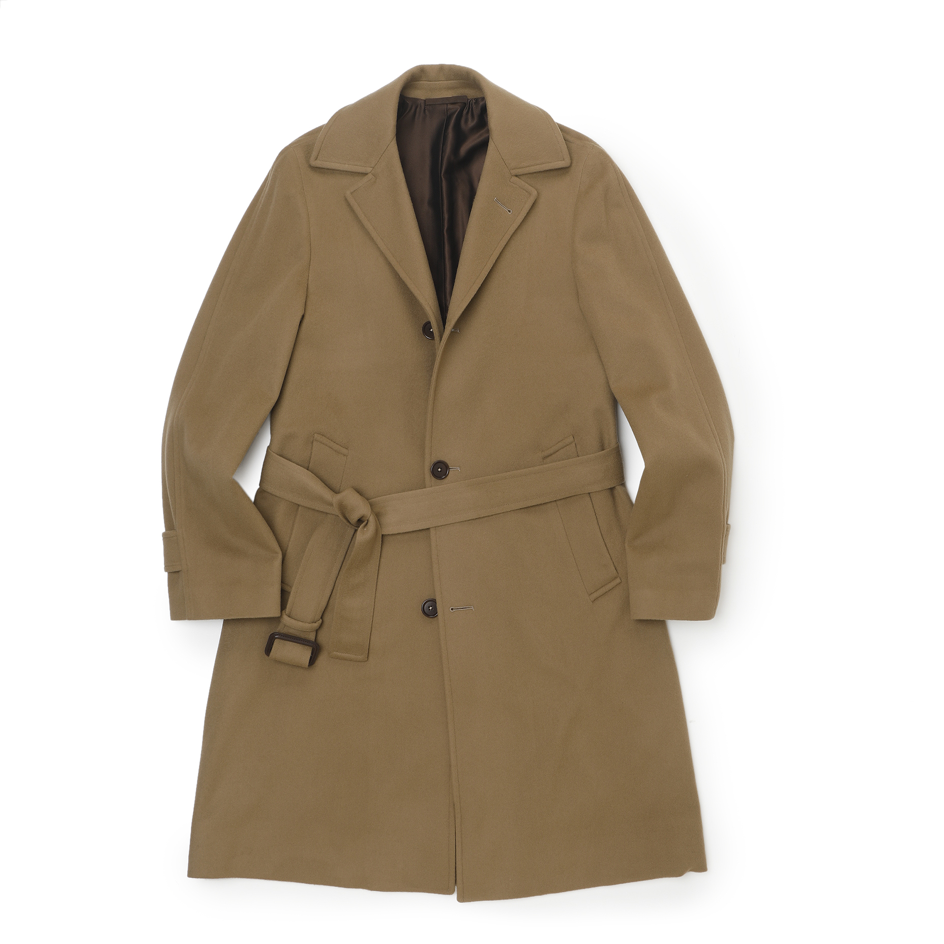 ベルテッドコートは個人的に大好きなアイテムであり、実際試着した時「さすが…」と感じました。ベルトを男らしく結んだシルエット、ベルトを締めずにポケットに入れたこなれた着こなし、上品な風合いのカシミア混はやはり格別。スーツスタイルからカジュアルスタイルまで使えるこちらのコートを是非男らしく、そして上品に着こなしてみてはいかがでしょうか。襟を立てたスタイルはしっかり首元が隠れ、着丈は膝上5cm程の長さでした。細身体型でジャケットの上からサイズ46を着用しぴったりでしたので、普段選ばれているサイズでよろしいかなと。